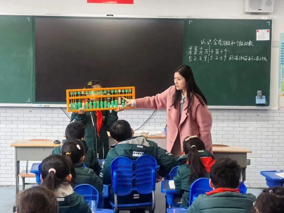四(11)班数学老师冯冬卉这节课讲授《认识多位数》。她带来一把大大的黄绿色算盘,一下子就吸引了孩子们的注意力。冯老师不断抛出问题,孩子们积极思考,热烈回应,上台操作,一节课结束,冯老师的板书写满了整整两大块黑板。