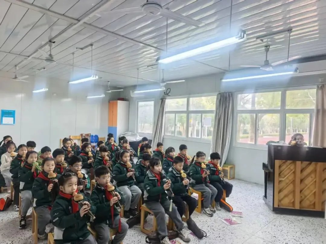 音乐教室里传来《萱草花》乐曲,杨乐老师弹琴,二(3)班同学一起吹奏葫芦丝。