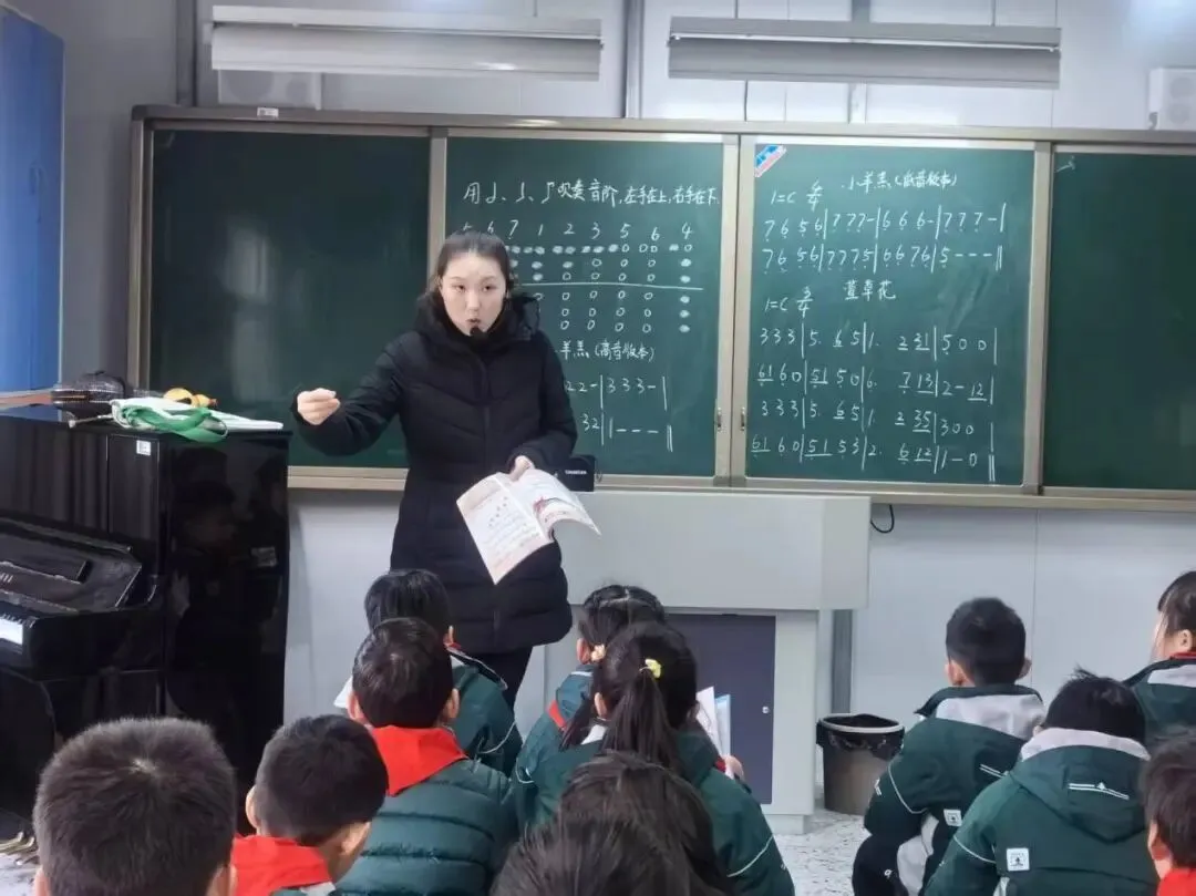 黑板上,杨乐老师提前写好了《小羊羔》《萱草花》等乐曲的音阶板书,并且标注了注意点。“葫芦丝是我们学校的校本特色小乐器,每个孩子都会吹。”杨老师还带着同学们一起学习了音乐课本上的新歌,逐句教唱,吐字、发声、情绪……