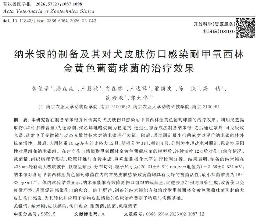 本研究利用灵芝提取物生物合成平均尺寸20 nm的球形纳米银,对MRSA等常见皮肤感染致病菌具有高效抗菌活性(MIC 16-32 μg·mL⁻¹)。体内试验证实纳米银能有效降低犬伤口载菌量,通过促进胶原沉积、血管生成和改善免疫微环境(M2型巨噬细胞极化),显著促进MRSA感染伤口的愈合,效果优于阳性对照恩诺沙星。该研究为纳米银转化应用于宠物皮肤感染的临床治疗奠定了物质与实践基础。