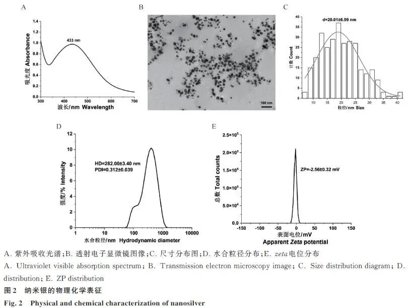 UV-vis光谱显示,纳米银在433 nm处有最大吸收峰(特征性SPR峰),溶液颜色由无色变为黄褐色(图2A);TEM显示,纳米银呈球形,分布均匀,无明显聚集(图2B);粒径统计呈正态分布,平均尺寸为(20.01±6.99)nm(图2C);HD为(282.00±3.40)nm,PDI为0.312±0.039,ZP为(-2.56±0.32)mV,表明体系稳定、分布均匀(图2D、E)。