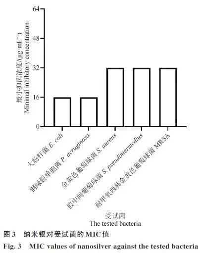 灵芝提取物无抗菌活性,纳米银对所有受试菌均有抗菌活性;革兰阴性菌(大肠杆菌、铜绿假单胞菌):MIC = 16 μg·mL⁻¹;革兰阳性菌(金黄色葡萄球菌、假中间葡萄球菌、MRSA):MIC = 32 μg·mL⁻¹(图3),纳米银对革兰阴性菌抗菌作用更强。
