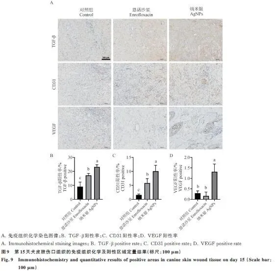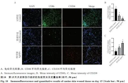 Baird-Parker平板显示所有犬只伤口均成功感染MRSA(黑色金属光泽菌落)(图4)。伤口外观及愈合模拟图显示,第6天起纳米银组和恩诺沙星组伤口闭合显著快于对照组;第15天纳米银组相对伤口面积(10.55%±2.19%)显著小于恩诺沙星组(16.03%±2.37%),愈合速度快于阳性对照(图5).载菌量测定显示纳米银与恩诺沙星均能显著降低伤口细菌负荷(从~6 CFU·g⁻¹降至~3 CFU·g⁻¹),抗菌效力与恩诺沙星相当(图6)。HE染色:对照组表皮缺失、胶原纤维少、炎性细胞浸润多;恩诺沙星组表皮增厚但断裂;纳米银组表皮明显增厚、角化层可见肉芽组织、胶原纤维丰富、炎性细胞浸润少(图7)。马松染色:纳米银组和恩诺沙星组胶原纤维含量显著高于对照组,纳米银能有效促进胶原沉积(图8)。免疫组化:纳米银组TGF-β、CD31、VEGF阳性率显著高于对照组和恩诺沙星组,表明纳米银通过促进肌纤维生成和血管生成加速愈合(图9)。免疫荧光:纳米银组CD86(M1型促炎巨噬细胞)荧光强度显著降低,CD206(M2型抗炎巨噬细胞)荧光强度显著升高,表明纳米银能改善伤口免疫微环境,促进巨噬细胞向抗炎M2型极化(图10)。
