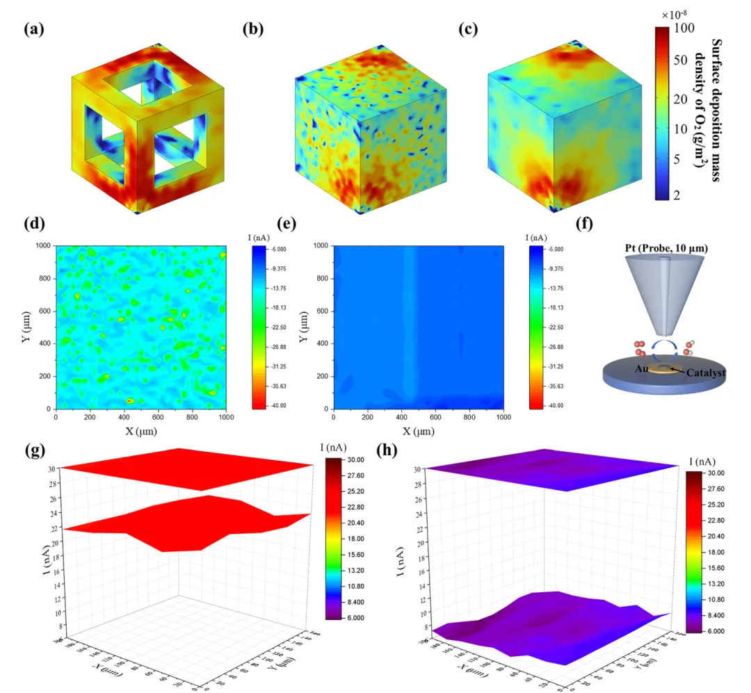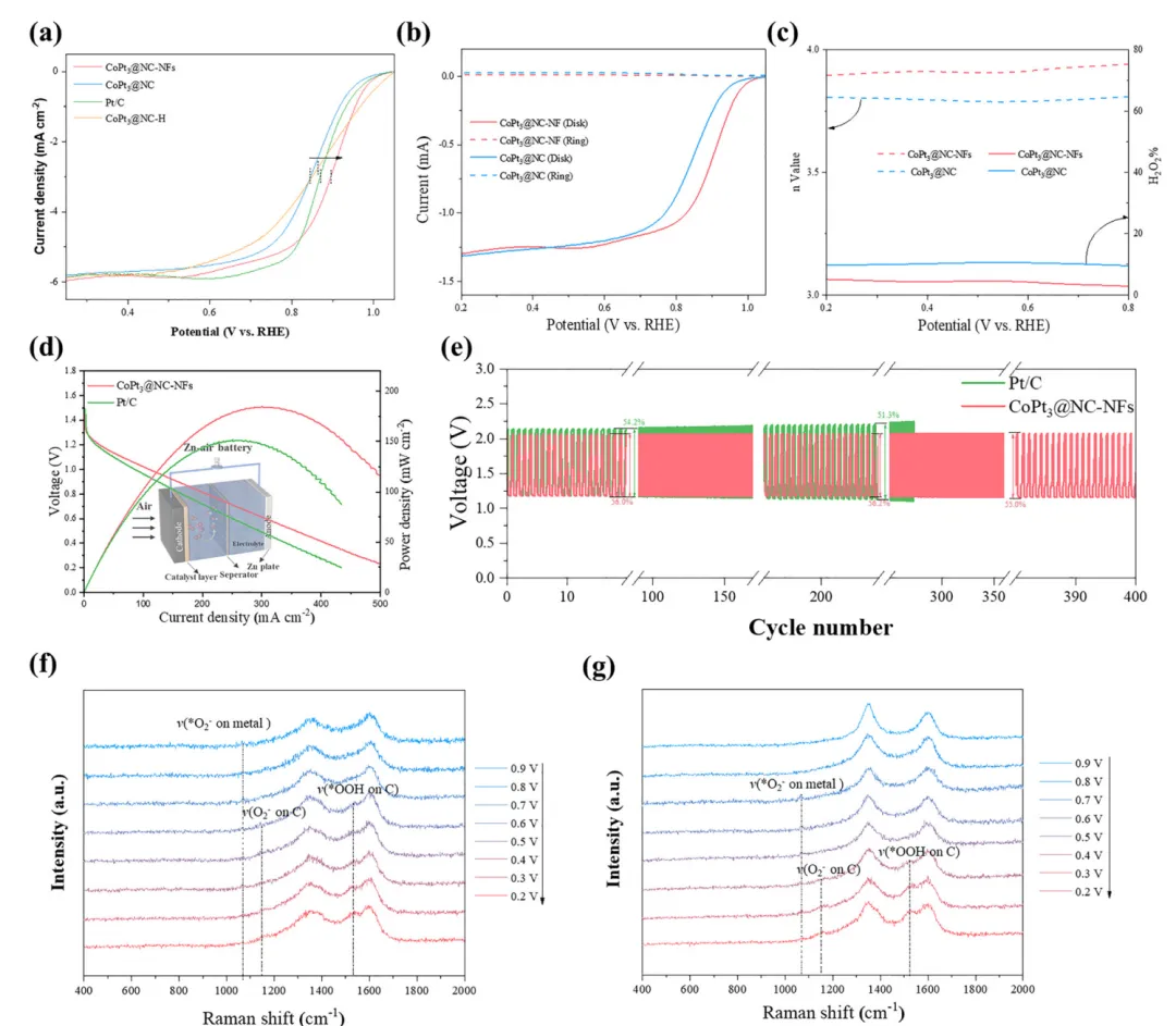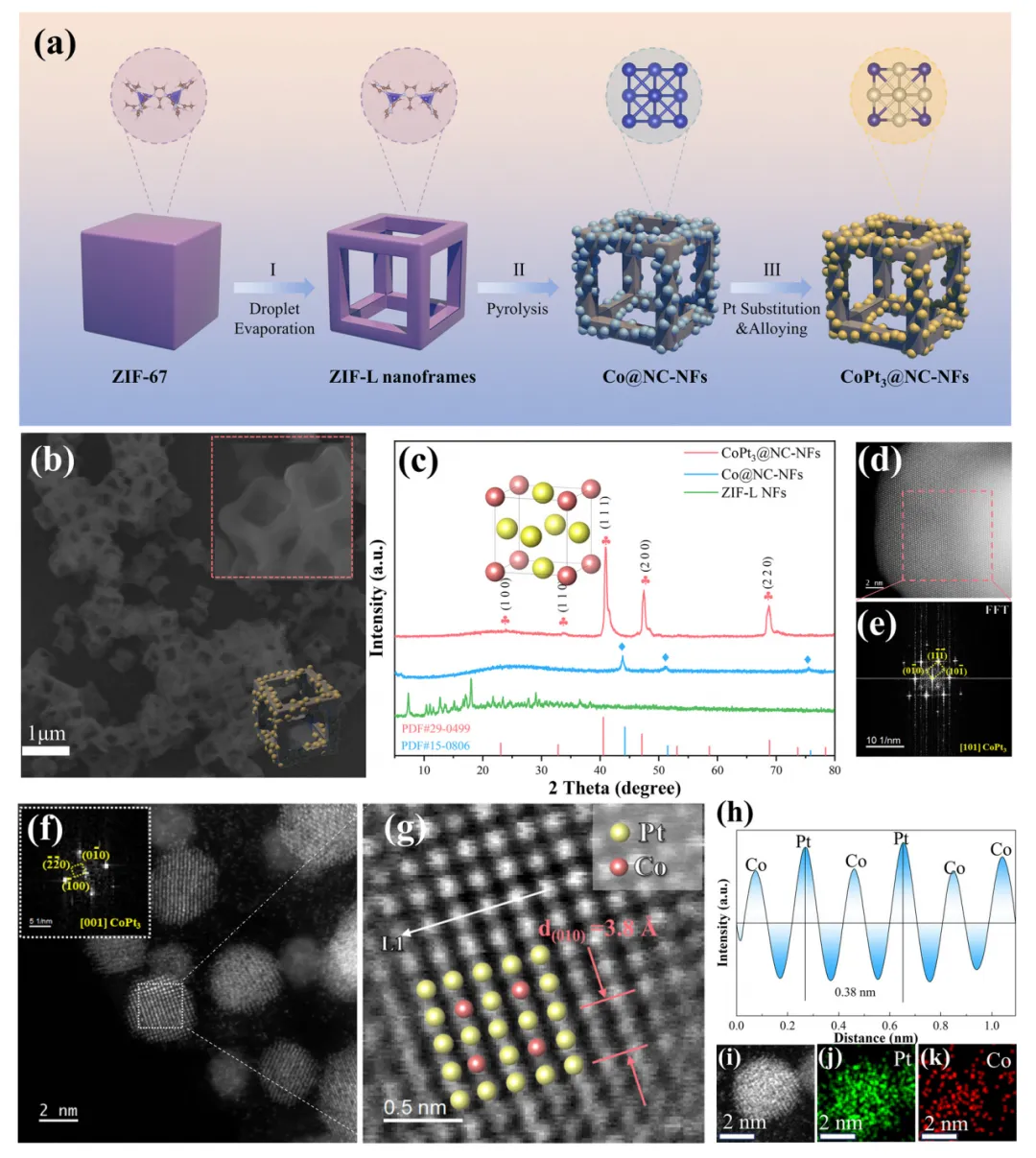 氧还原反应(ORR)是燃料电池、金属-空气电池等可持续能源转化存储器件的关键过程,但其效率受限于缓慢的O₂传质。本文制备了仅由边、角构成的CoPt₃基纳米框架催化剂(CoPt₃@NC-NFs),该结构在电化学反应中聚集电流密度,放大表面磁场强度,增强作用于顺磁性O₂分子的开尔文力,驱动O₂定向快速向催化剂高场区域迁移,提升O₂传质效率。该催化剂在0.1 M KOH中展现优异ORR性能,起始电位1.02 V、半波电位0.89 V、极限电流密度-5.8 mA cm⁻²,组装的锌-空气电池在305 mA cm⁻²下功率密度达184.8 mW cm⁻²。本研究建立了催化剂微观结构与表面磁场的关联,揭示自发磁场增强机制,为提升电催化活性提供了新的物理视角,该催化剂在新能源转化器件中具有极高的实际应用潜力。(498字)氧还原反应(ORR)作为燃料电池、金属-空气电池等能源转化技术的核心阴极反应,其效率直接决定器件整体性能,却受四电子转移的多步反应机制和缓慢的O₂传质过程制约,成为器件性能提升的关键瓶颈。近年来,科研人员围绕电子结构工程开发了杂原子掺杂、缺陷工程、纳米限域效应等策略,有效调控催化活性位点的d带中心与电荷分布,提升了ORR催化活性和反应动力学,但这类策略仍聚焦于催化活性强化,对O₂传质动力学这一核心瓶颈的解决进展有限,导致活性位点利用率低,催化潜力无法充分发挥。电催化体系中,催化剂-电解质界面传质由浓度扩散、电场迁移和对流共同调控,现有研究主要通过构筑中空、多孔结构等微纳结构工程提升浓度扩散,以强化O₂传质。但反应过程中局部浓度梯度会逐渐衰减,扩散驱动的传质效率下降,且扩散的随机性无法实现O₂在催化活性中心的定向富集,造成传质与反应位点的空间失配,大量活性位点闲置。基态O₂分子具有本征顺磁性,为磁场调控传质提供了物理基础,顺磁性物种在非均匀磁场中会受到开尔文力作用向高磁场区域迁移,但其单分子受力较弱,需结合其他传质方式发挥作用。现有研究多依赖外加磁场构建磁场梯度,却无法实现O₂在微纳尺度活性位点的定向富集。而电化学反应中电流通过材料会产生非均匀本征磁场,其强度与表面电流密度线性相关,通过结构设计聚集电流密度、增强本征磁场,成为定向引导O₂至活性位点的全新思路,相关研究目前仍处于空白阶段。(986字)本文开发了简易高效的自发表面磁场增强策略,构筑了仅由边、角构成的CoPt₃基纳米框架催化剂(CoPt₃@NC-NFs),实现O₂分子在催化活性位点的主动定向富集,显著提升ORR催化性能。有限元模拟证实,该纳米框架在电催化过程中使电流沿边界空间限域分布,局部电流密度增强并诱导自发表面磁场提升,强化的磁场进一步增大作用于O₂的开尔文力,推动O₂快速定向向催化剂表面迁移。原位拉曼光谱和扫描电化学显微镜(SECM)验证了磁场增强可加速O₂在催化剂表面的定向富集,大幅提升ORR性能。本研究阐明了纳米框架结构诱导自发磁场增强的特性,结合模拟与实验揭示了磁场增强驱动O₂在活性位点主动定向聚集的核心机制。(489字)对Pt(111)、CoPt(111)、CoPt₃(111)进行DFT计算,发现U=1.23 V时CoPt₃的决速步为*OOH形成(ΔG=0.51 eV),能垒远低于Pt和CoPt,展现最优ORR催化潜力;其d带中心更低,与氧的成键作用较弱,需强化O₂吸附以提升反应性。有限元模拟构建立方、中空、框架三种500×500×500 nm的CoPt₃模型,发现框架模型在电化学过程中产生的磁场显著强于其他结构,10 nA下其最大磁场强度为立方模型的1.25倍、中空模型的1.34倍,且磁场强度随电流增大的增强效应更显著,磁场线向催化剂表面聚集,为O₂定向迁移提供了梯度条件。以立方ZIF-67为前驱体,经马兰戈尼效应制备ZIF-L纳米框架,再经N₂退火、Pt²⁺交换与重组,成功制备CoPt₃@NC-NFs,同时制备立方结构CoPt₃@NC和中空结构CoPt₃@NC-H作对比。表征显示CoPt₃@NC-NFs保持规整纳米框架结构,CoPt₃为FCC晶型,金属颗粒粒径5~20 nm,Co、Pt、N、C元素分布均匀,形成有序金属相间结构。该催化剂石墨化程度更高、电导率更优,介孔为主且平均孔径大于6 nm,BET比表面积达180.0 m² g⁻¹,为反应提供充足活性位点与传质通道;XPS证实Pt/Co原子比接近3,且元素结合能存在轻微负移;磁滞回线测试表明其矫顽力达300 Oe,铁磁性远优于CoPt₃@NC,增强了与顺磁性O₂的相互作用。在O₂饱和0.1 M KOH中,CoPt₃@NC-NFs的ORR峰电位达0.92 V,1600 rpm下起始电位1.02 V、半波电位0.89 V,性能优于CoPt₃@NC、CoPt₃@NC-H和商业Pt/C。Koutecky-Levich曲线与RRDE测试表明,该催化剂平均电子转移数约3.96,遵循四电子转移路径,过氧化氢产率仅4.8%,催化选择性最优;12 h耐久性测试无明显电流衰减,稳定性优异。将其组装为锌-空气电池阴极,开路电压稳定在1.50 V,305 mA cm⁻²下功率密度达184.8 mW cm⁻²,远高于Pt/C基电池;不同电流密度下放电平台更高,10 mA cm⁻²下比容量达815.2 mA h g⁻¹;400次充放电循环后电压间隙无明显增大,往返效率略有提升,而Pt/C基电池300次循环后即失活,体现了该催化剂优异的实际应用性能。原位拉曼光谱监测发现,CoPt₃@NC-NFs在0.9 V即出现金属位点O₂⁻吸附峰,0.6 V出现碳位点O₂⁻和OOH峰,均远早于CoPt₃@NC,表明磁场增强加速了O₂吸附与决速步OOH的形成。有限元模拟O₂分布发现,有电流时框架模型表面O₂扩散速率与沉积量均高于立方、中空模型,1 h后O₂沉积量达9.3×10⁻⁷ mg cm⁻²,而无电流时中空结构O₂吸附能力
