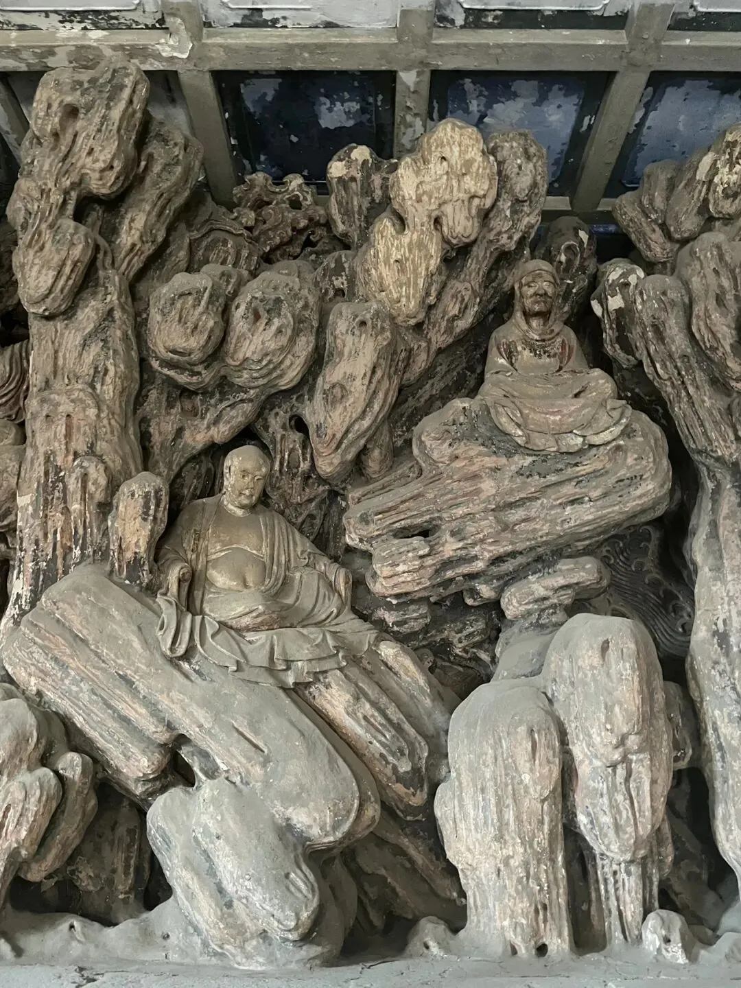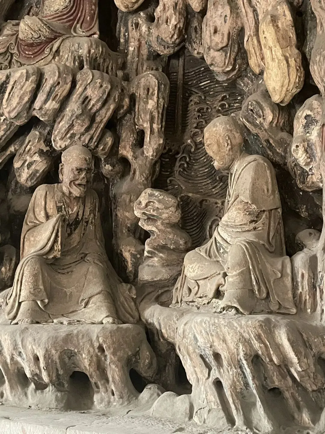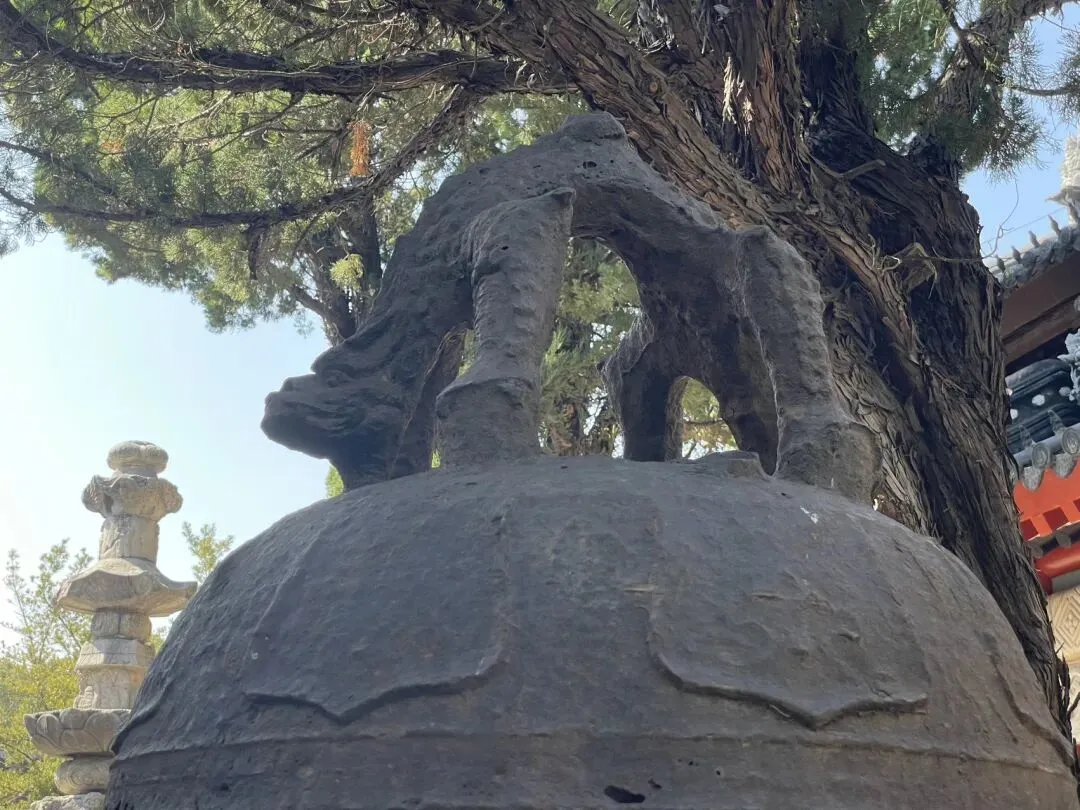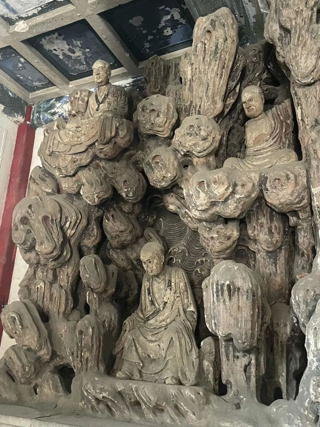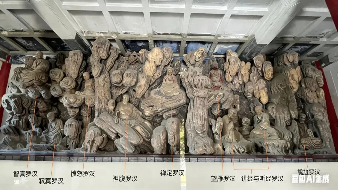 简单说,就是雕造“佛顶尊胜陀罗尼经幢”能解除一切恶道之苦,众生在陀罗尼幢附近,他们的影子映在幢上,或者风吹陀罗尼幢上的尘落在他们身上,这些众生所有应堕入恶道的罪业将不会发生,他们也不会被罪垢所染污,并会得到净化。另外,绕经幢祈福请按顺时针方向,竟然还有不少人不清楚。 第六,清大铁钟。铁钟与经幢一左一右,钟顶的提梁兽是龙🐲的第四子蒲牢。 第七,壁塑罗汉。独创的“塑壁”形式:罗汉并非独立摆放,而是错落镶嵌在巨大的山水塑壁之中。塑壁以木骨架构造层叠的山岩、洞窟、云水、树木,营造出罗汉在自然中修行的意境,是一幅立体画卷,这在中国古代彩塑中极为罕见。我请AI帮忙标注了一下照片。