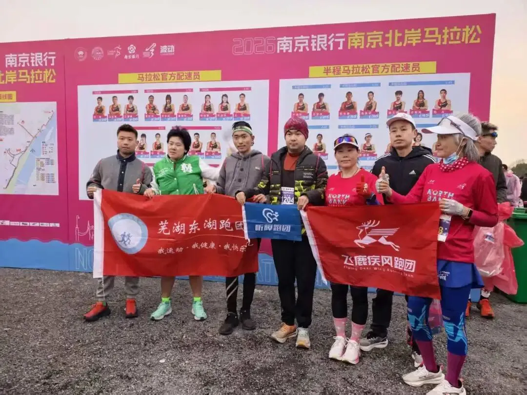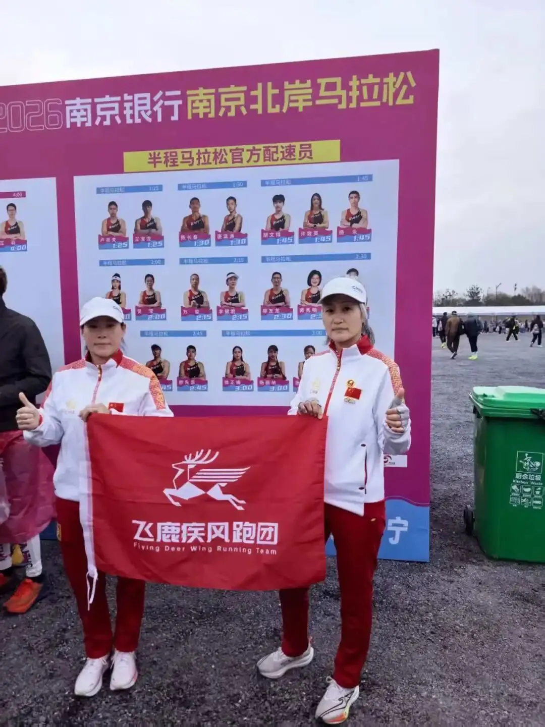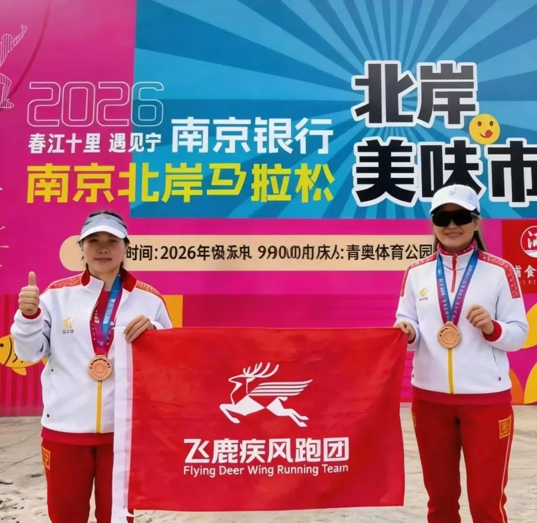 2026南京北岸马拉松的完赛奖牌挂在胸前,飞鹿疾风跑团的旗帜也扬得鲜亮。两个竖起的大拇指,是对这场奔跑最好的总结——跑过赛道,团魂更热,这枚奖牌,是我们一起赢来的甜。