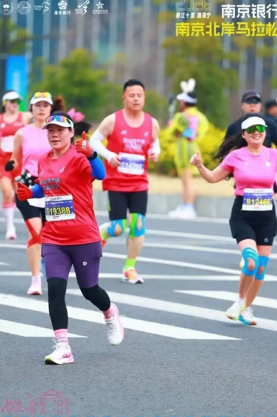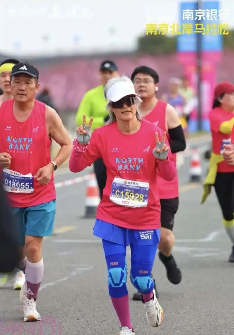 2026南京北岸马拉松的赛道上,粉衣方阵里的银发跑者自带高光——墨镜遮不住眼里的锐气,比耶的手势裹着风,跑姿里是藏不住的热爱。年龄从不是限制,脚下的每一步,都是“我仍年轻”的最好证明。