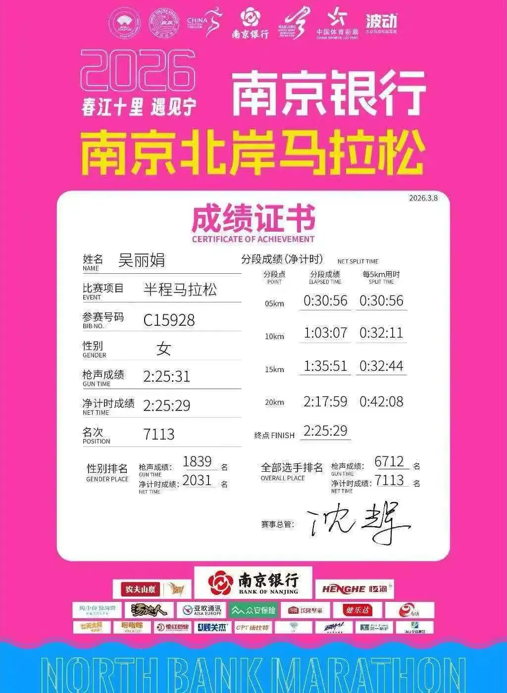 50多岁的吴丽娟,常年驰骋赛道,多次征战马拉松的身影已然熠熠生辉。此次以2:25完赛,虽与官方配速员2:15的目标略有差距,稍留遗憾,但这份执着坚守与滚烫热爱,早已超越完赛成绩本身。年龄从不是奔跑的枷锁,后续勤加练习、稳住节奏、提升步频,目标就在前方,我们继续向前奔跑!