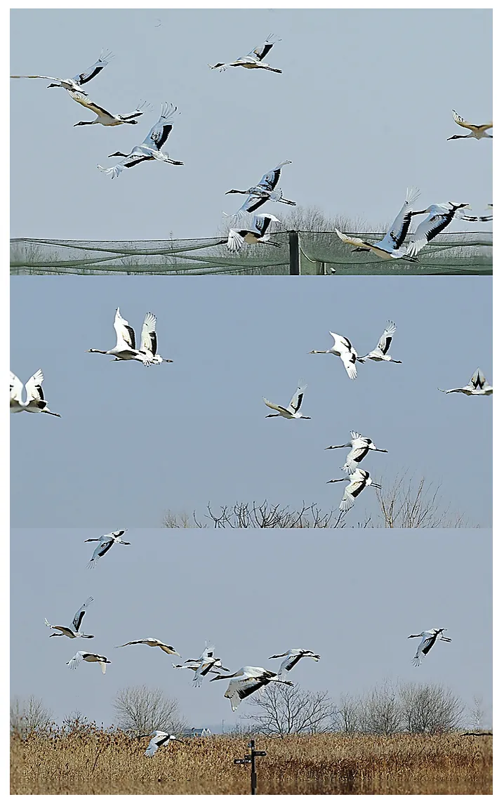 红色的碱蓬草,在海边烧成了一片晚霞。几只丹顶鹤的影子,轻轻划破了水面,没留下一丝涟漪。