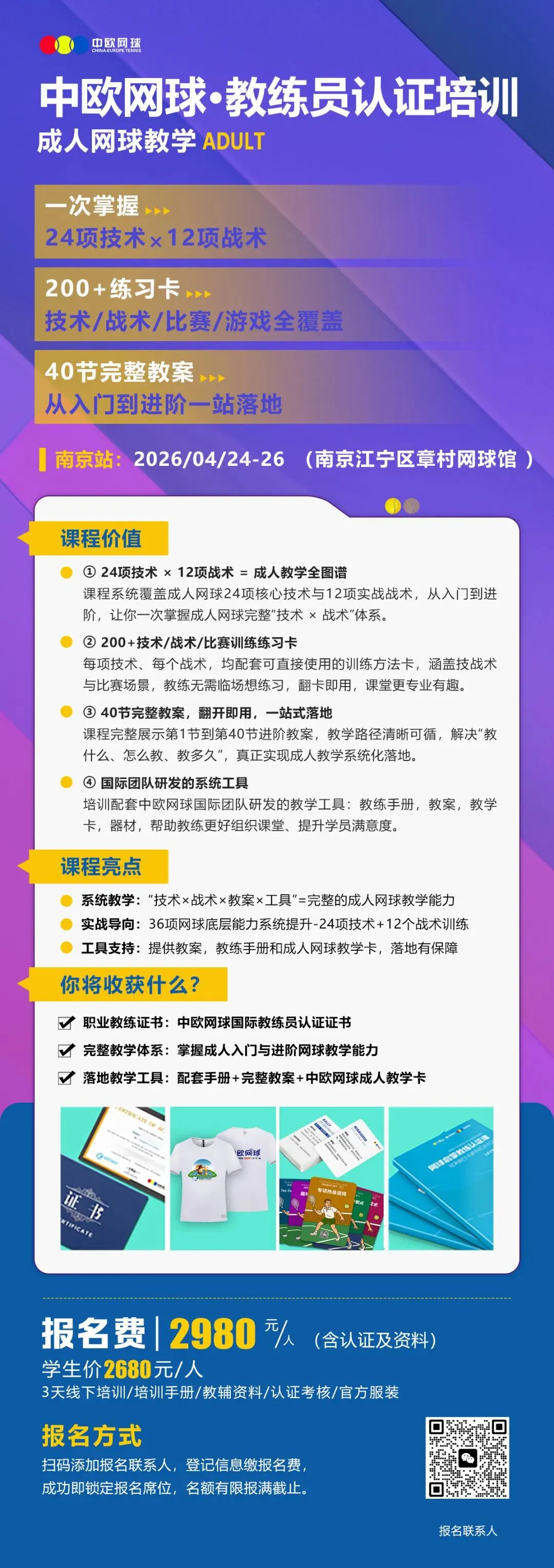 本课程由中欧网球国内外专家团队联合研发,融合国际先进的网球教学理念与中国成人教学的真实实践经验,聚焦成人网球教学中最核心、最常见的难题,帮助教练系统提升成人网球教学能力。课程不仅关注技战术本身,更覆盖从课程设计、课堂组织、教学表达,到学员沟通与客户维护的完整教学能力,助力教练实现从“会教球”到“教得专业、教得长久”的全面升级。