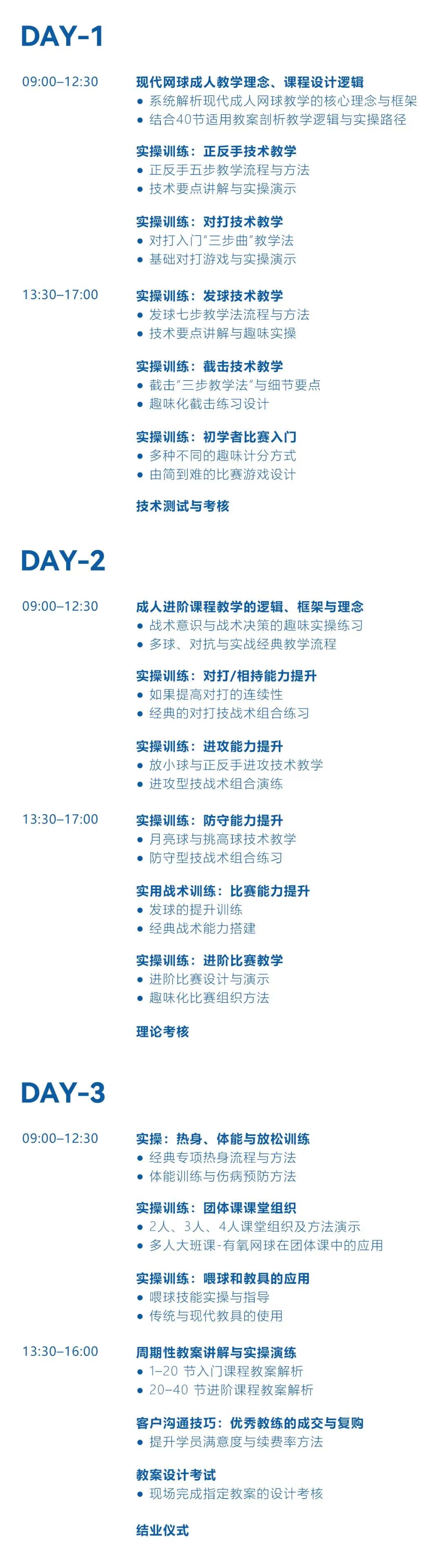 课程将成人教学中的重难点进行系统拆解,通过24项核心技术 × 12项实用战术构建清晰的成人入门与进阶教学框架,针对“教什么、怎么教、教多久”给出明确答案。结合中欧网球教学工具《40节成人入门及进阶教案》及《成人网球教学卡片》,每一节课、每一个练习都有据可循,帮助教练在培训结束后回到球场即可落地执行,真正把体系用起来,把教学做扎实。