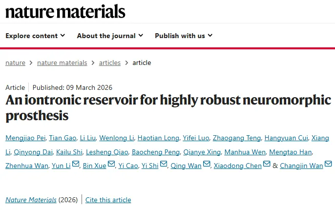南京大学万昌锦副教授、施毅教授、薛斌副教授、李昀教授和新加坡南洋理工大学陈晓东教授、甬江实验室万青教授合作,开发出一种基于水凝胶的离子电子储层(HIRE),实现了兼具卓越物理与功能鲁棒性的神经形态假体。该系统利用水凝胶-电极界面的非线性动力学作为物理储层预处理时间序列信号,对外界物理损伤的敏感度极低。研究显示,该HIRE系统在语音识别任务中达到了95%的准确率,并在断裂面重新接触后0.02秒内即可恢复此能力,在神经康复过程中远超生物系统。此外,其pH敏感的动力学特性还能在大鼠模型中实现自适应闭环神经刺激控制,为神经康复和感觉运动功能修复验证了其巨大潜力。相关论文以“An iontronic reservoir for highly robust neuromorphic prosthesis”为题,发表在Nature Materials上。