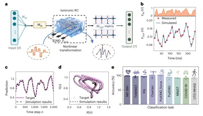 图3.基于HIRE的储层计算网络架构与仿真验证 a, 基于HIRE的储层计算网络示意图。系统利用水凝胶中的离子迁移过程获得储层状态,并通过忆阻器交叉阵列进行线性回归运算得到最终输出。Win和Min分别是输入权重和输入掩码。 b, HIRE器件的实测电压输出与基于器件模型的仿真结果。 c, Mackey-Glass时间序列的预测结果。粉色线代表待估计的真实数据,黑色虚线代表基于器件模型的预测输出。 d, 预测结果的二维显示。X和Y是n的函数。 e, 使用标准数据集对九种不同智能任务的分类准确率。MIT-BIH,麻省理工学院-贝斯以色列医院心律失常数据库;TI46NIST,德州仪器46词语音语料库;Iris,费雪鸢尾花数据集;Ovarian,卵巢癌数据集;PutEMG和PutEMG-force,波兹南科技大学的表面肌电信号数据集;MNIST,国家标准与技术研究所手写数字修改数据库;COVID-19,COVID-19放射学数据库;UTD-MHAD,德克萨斯大学达拉斯分校多模态人体动作数据集。数据以均值±标准差表示,n=10(10折交叉验证)。