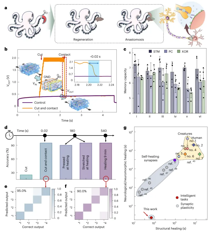 图4.HIRE系统中智能任务的恢复 a, 章鱼通过再生或治疗实现智能康复的示意图,两者都能导致认知恢复。 b, 切割和功能愈合过程中的电学测量。插图展示了HIRE器件的一个切割-愈合循环。 c, 不同计算任务(包括奇偶校验、短时记忆和异或运算)在六种不同物理状态下记忆容量的统计比较。数据以均值±标准差表示。样本量n=5代表在同一个器件上进行的五次独立测量。 d, 愈合过程不同时间点的语音识别任务计算性能。语音标签“down”、“up”、“cancel”和“confirm”分别用*1-*4表示。 e, 断裂的SHH表面重新接触后立即执行任务的语音识别结果(混淆矩阵),识别准确率达到95.0%。 f, 经过540秒充分结构愈合后的语音识别结果(混淆矩阵),识别准确率达到90.0%。 g, HIRE与现有神经形态器件及生物体在神经/神经形态愈合和结构愈合所需时间上的比较。编号1-7分别对应人类、蝾螈、斑马鱼、海鞘、果蝇和水螅、涡虫和海星。数据以均值±标准差表示,根据文献45-50中报道的参数上下限计算得出。