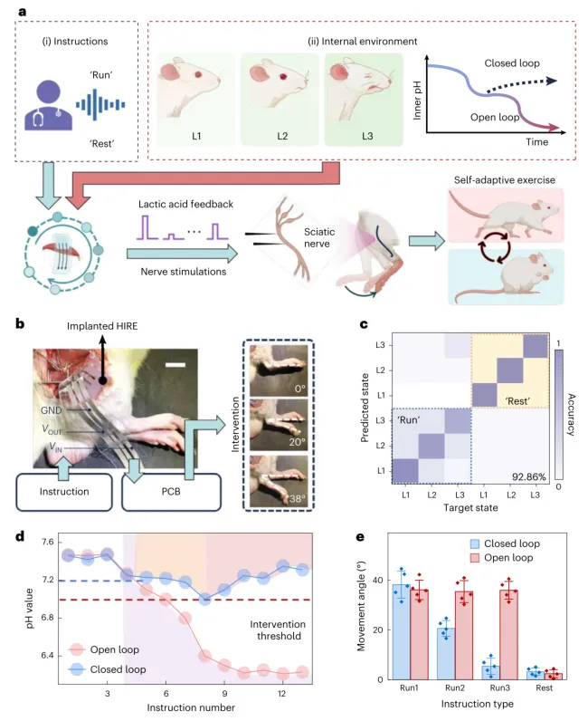 为验证其生物医学应用潜力,研究团队将HIRE器件植入大鼠体内,用于闭环神经刺激控制(图5a)。该系统整合了外部语音指令与内部生理监测,以局部肌肉pH值作为疲劳程度的指标(pH 7.4为休息良好,7.2为适度运动,7.0为疲劳)。HIRE器件展现出pH敏感的离子动力学特性,能同时进行语音指令识别和疲劳状态检测。植入器件被放置在小鼠腿部肌肉附近(图5b),语音指令处理后用于刺激小鼠坐骨神经,产生不同角度的腿部运动。测试结果显示,系统能高精度(92.86%)地识别不同pH环境下的语音指令(图5c)。在闭环控制模式下(图5d),当检测到pH降至7.2,系统自动将刺激幅度从5V降至4V,减缓腿部运动强度和pH下降速度;当pH进一步降至7.0,系统将刺激降至3V,使腿部运动角度(5.4±3.4°)接近静息状态(3.2±1.5°)(图5e),有效防止了因持续高强度运动可能导致的酸中毒。生物安全性评估也证实了HIRE器件在植入期间的生物相容性。