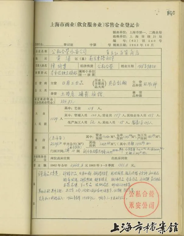 1963年,公私合营永安公司上海市商业零售企业登记卡。从登记卡上看,当时永安公司已经有东方红百货商店的名称(上海市档案馆藏)