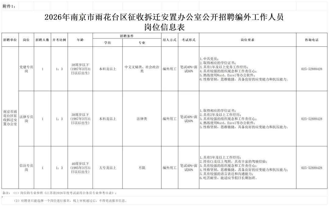 因业务需要,按照“公开、平等、竞争、择优”的原则,南京市雨花台区征收拆迁安置办公室现面向社会公开招聘编外工作人员3名,从事相关工作。现将有关事项公告如下: