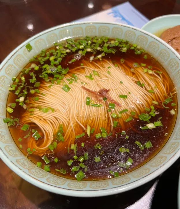 苏式汤面高汤浸面条,加酱油、如意哨子。选老面馆,清早最好吃。