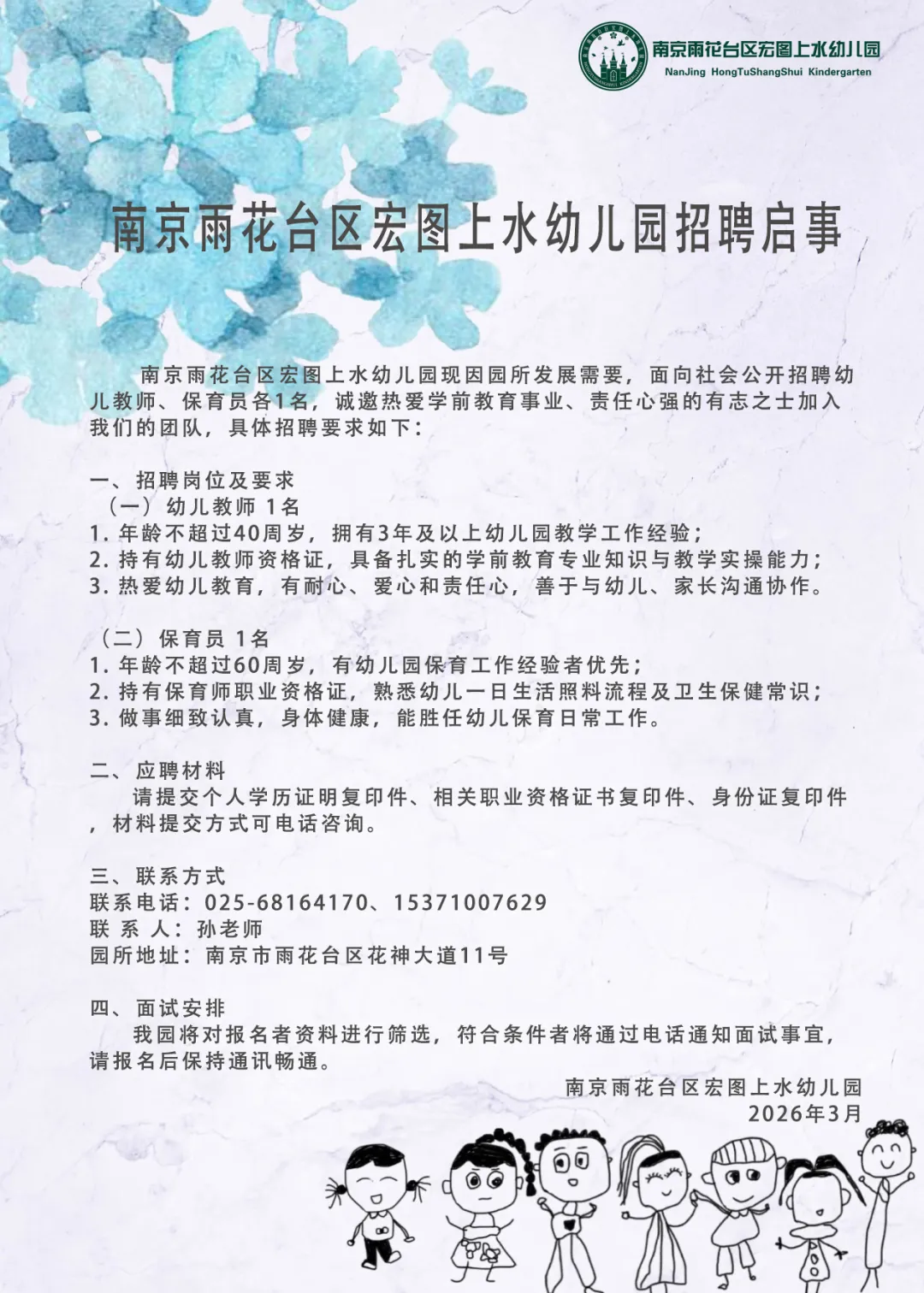 南京雨花台区宏图上水幼儿园招聘启事