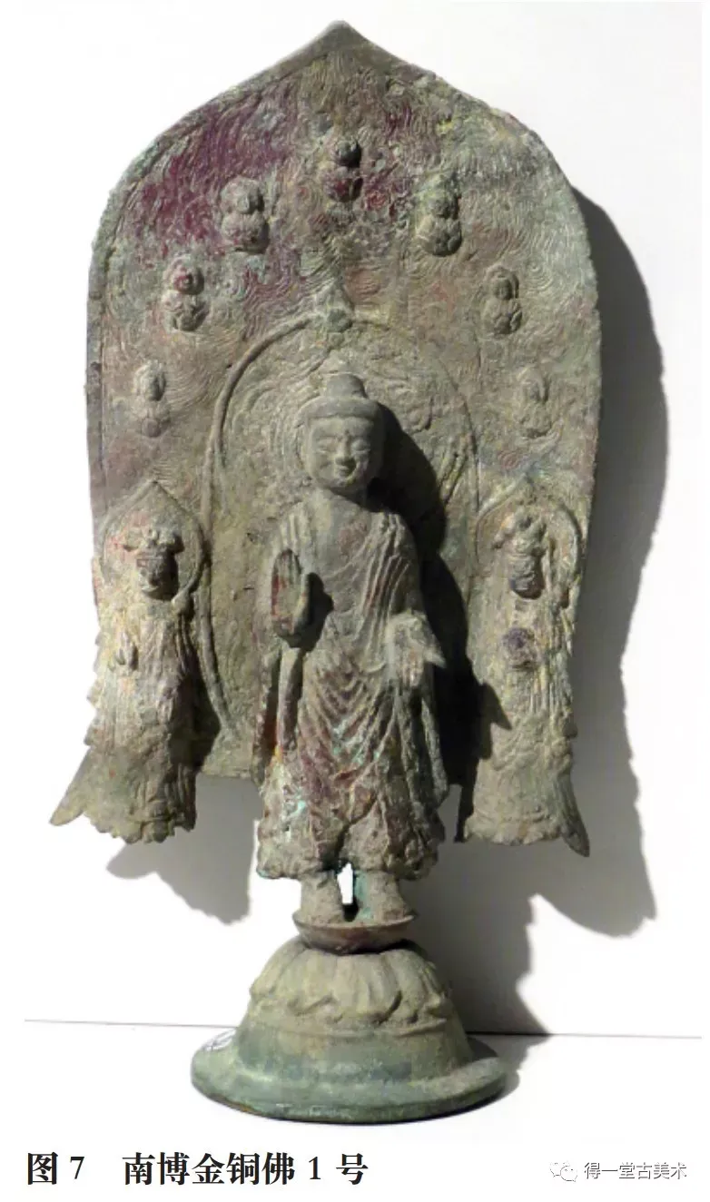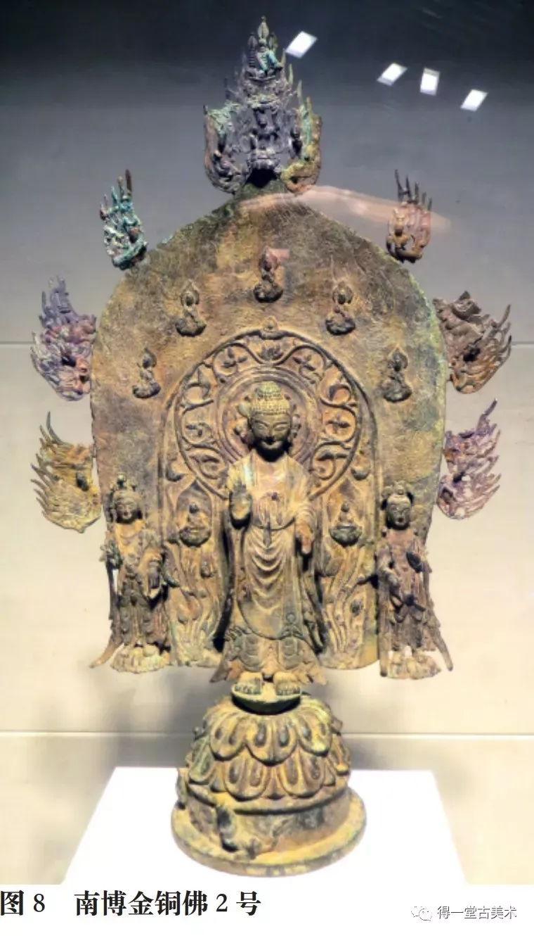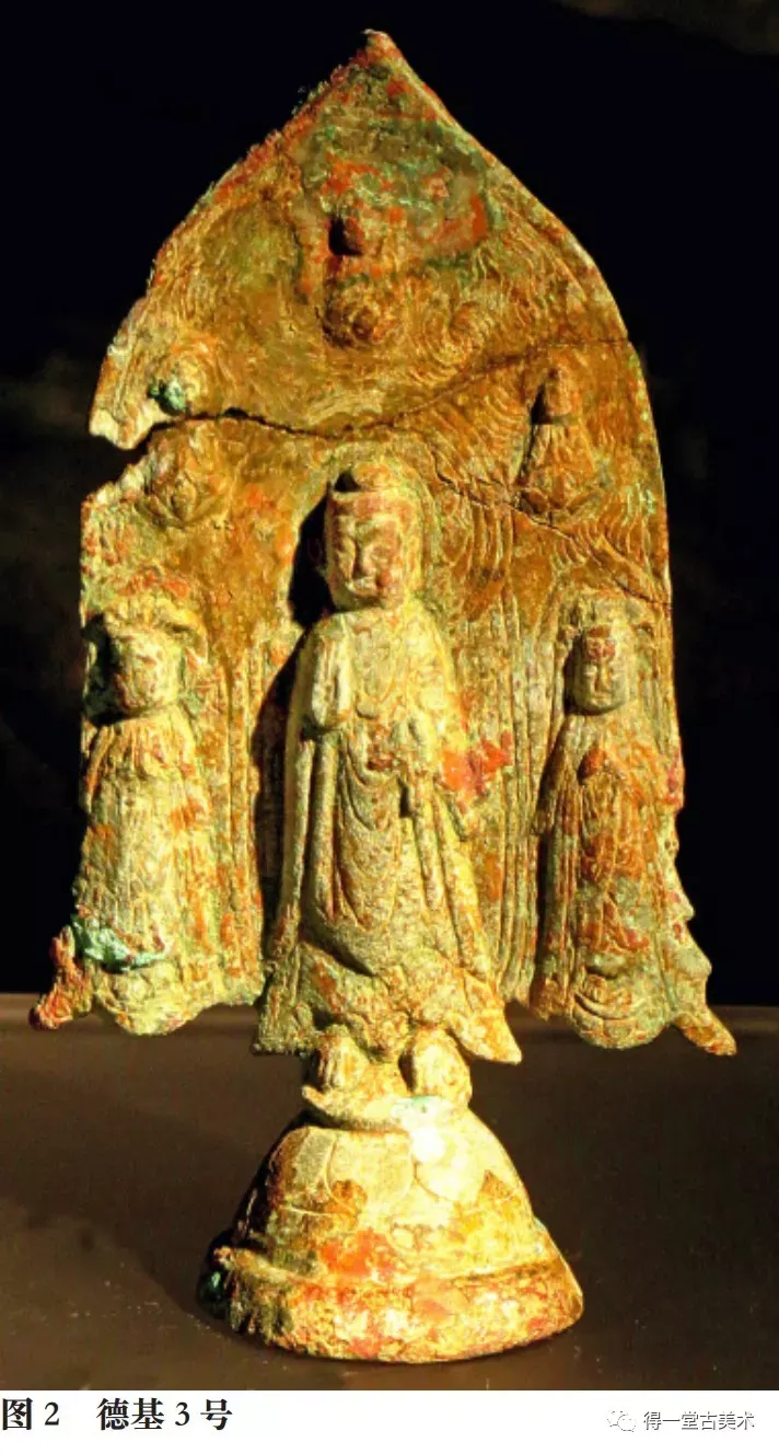 现存北方十六国至北朝时期的背屏金铜佛造像,以单尊像居多,并伴有许多二佛并坐像,其中背屏三尊像并非主流,这有别于德基出土的南朝金铜 造像常见的三尊像形式。