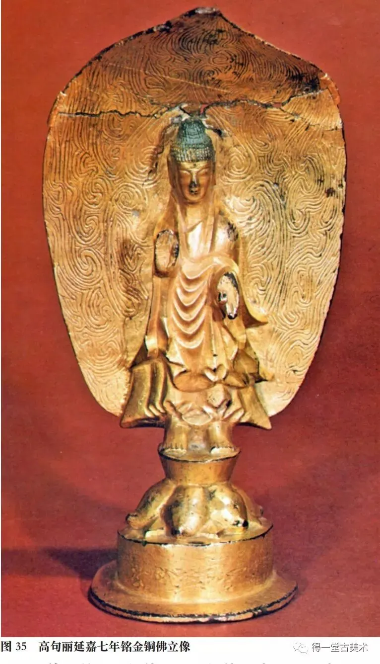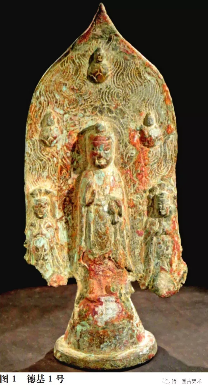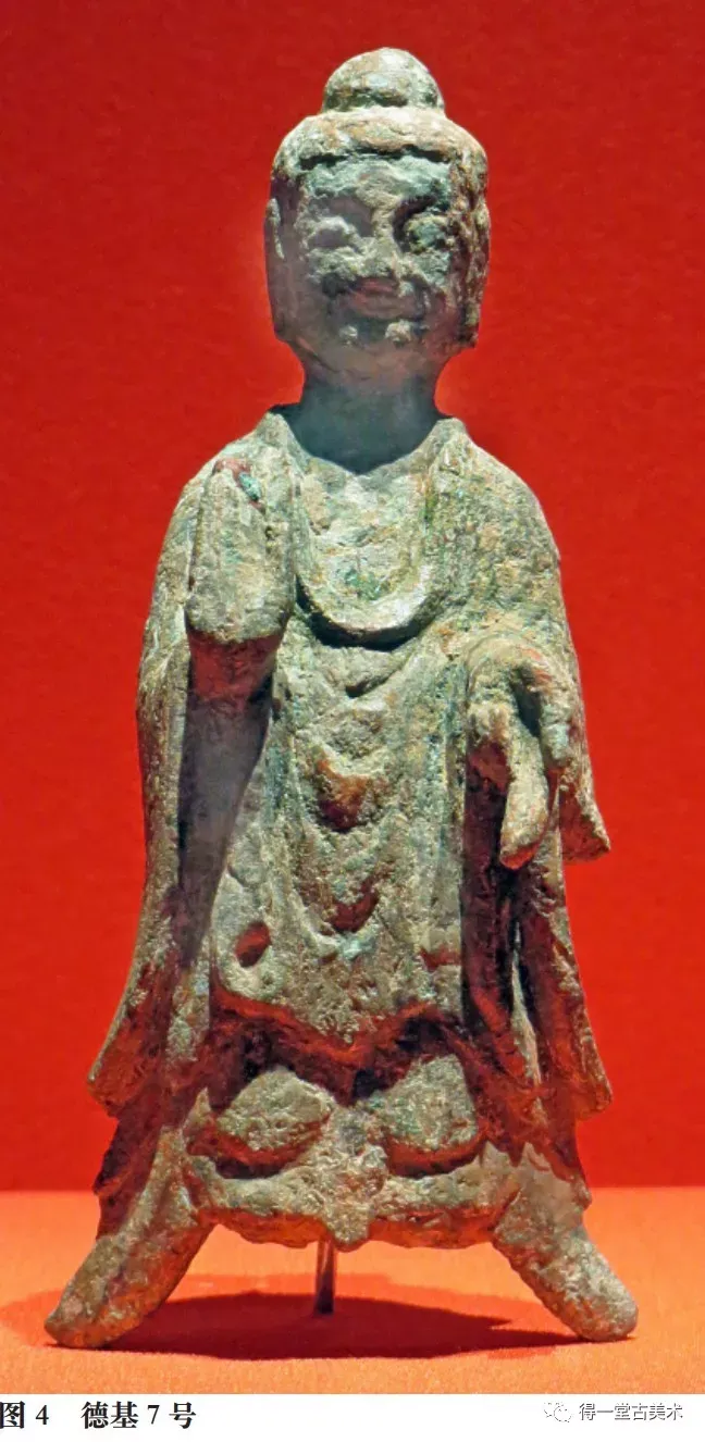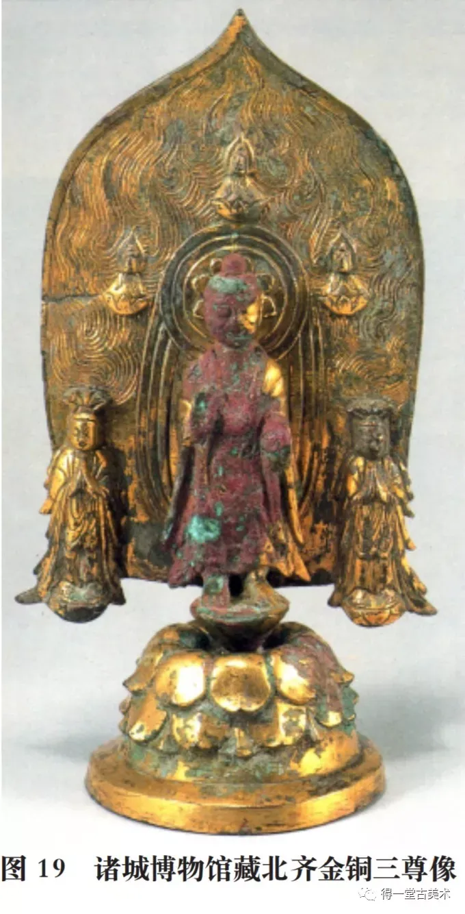 现存北方十六国至北朝时期的背屏金铜佛造像,以单尊像居多,并伴有许多二佛并坐像,其中背屏三尊像并非主流,这有别于德基出土的南朝金铜 造像常见的三尊像形式。