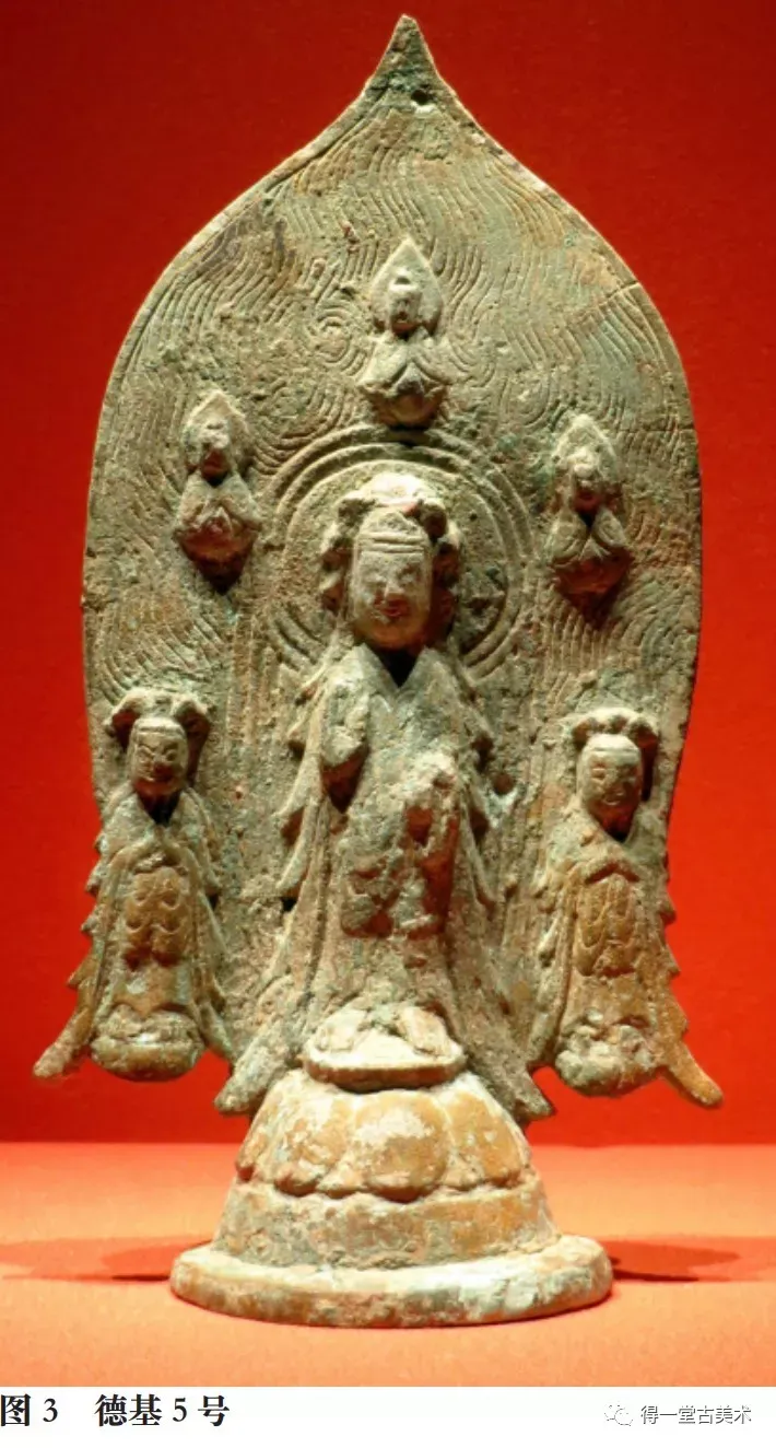 德基 4 号:南京六朝博物馆藏一佛二菩萨三立像,背屏较完整。 造像形制与大通元年造像类同,只是背屏略有残损。两侧胁侍菩萨发髻不清,外形呈扇形。