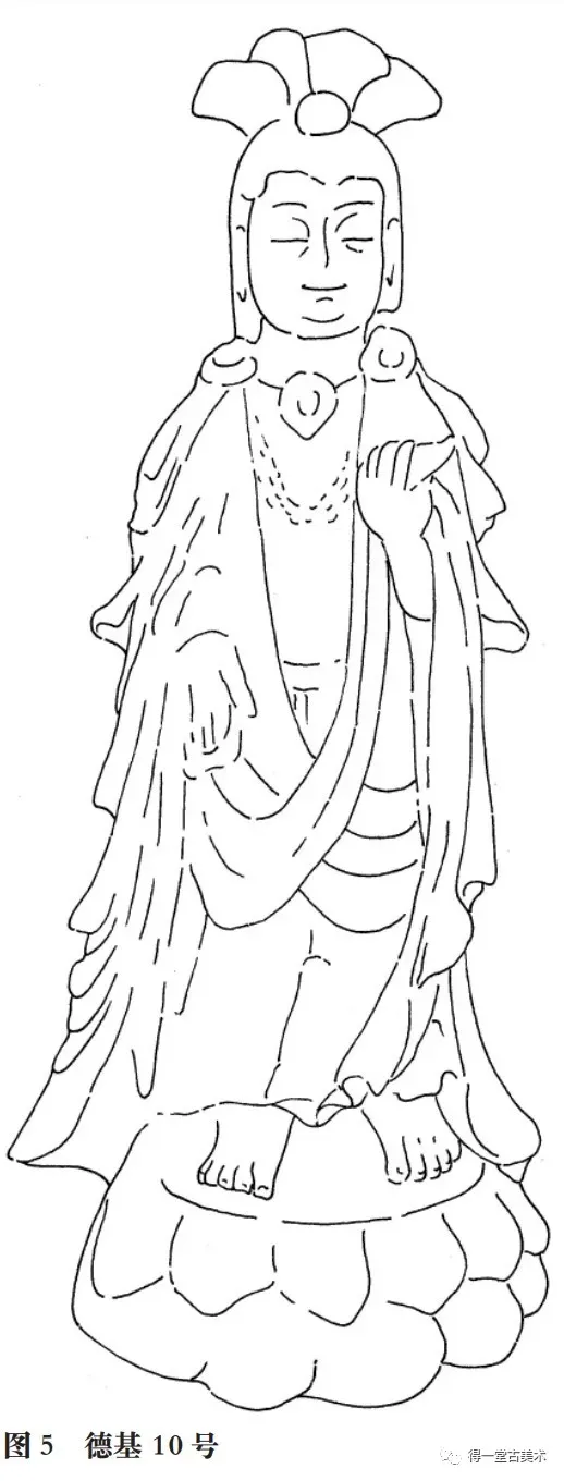 德基 11 号:菩萨立像,头残。 菩萨立于莲花台上,戴项饰,头发沿双肩呈蕨芽 形下垂。帔帛于身体两侧呈外展式下垂,帔帛和璎珞 均呈 X 型交于腹前,交会处饰一圆形物。左手手心向 内持莲蕾上举至左胸,右手握桃形物下垂至右腹。