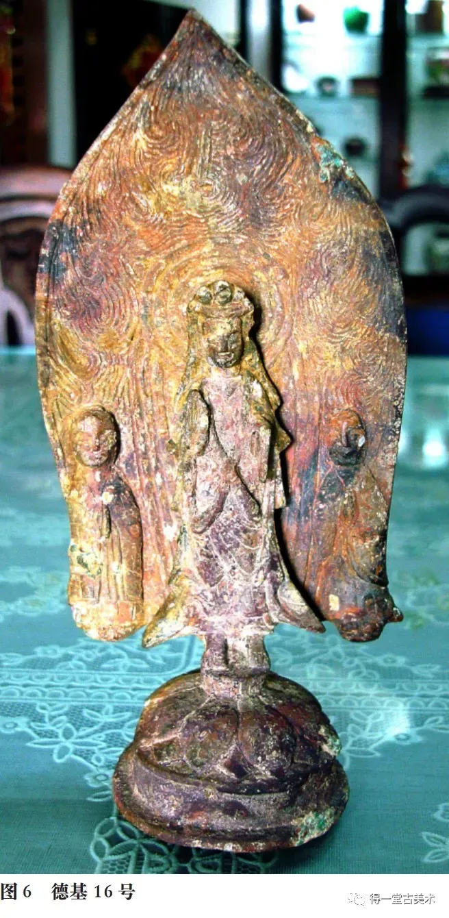 德基 6 号:南京六朝博物馆藏一菩萨并二胁侍 菩萨三立像,背屏较完整。 与德基 5 号造像形制基本相同,主尊菩萨头戴宝冠,饰三层头光,头光中心雕莲瓣,帔帛呈 X 型交 于腹前,两侧衣饰外展,右手施无畏印,左手不清。两 侧胁侍菩萨头发似作双髻,双手合掌。背屏上无化 佛,刻火焰纹,主尊头部右上方背屏有残损。
