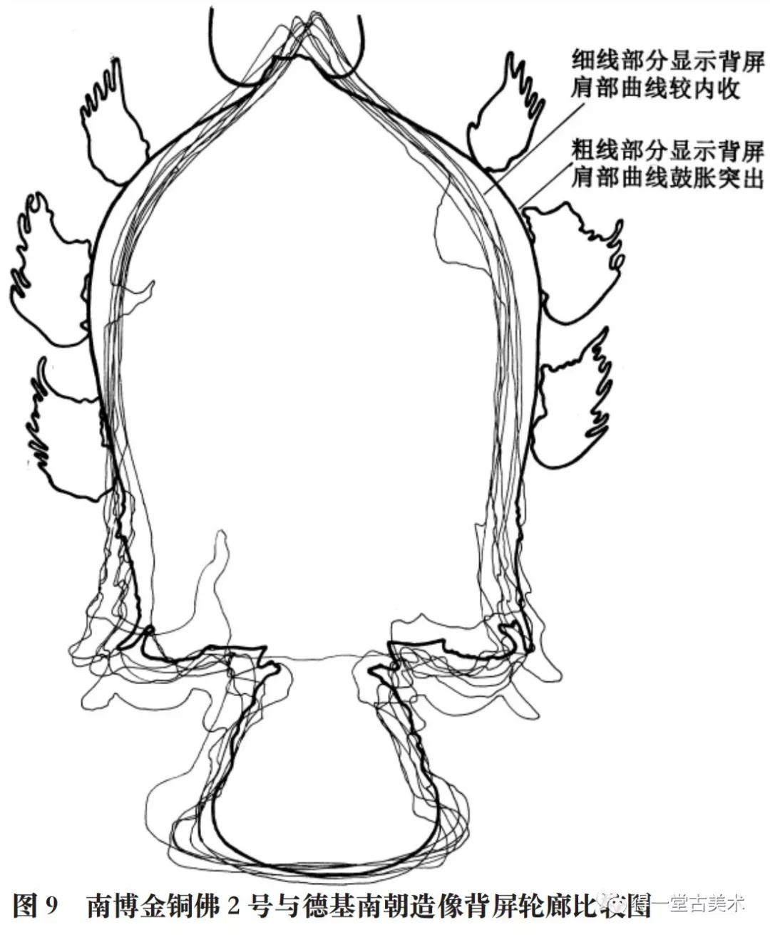 (2)将南博金铜佛 2 号的背屏外轮廓,与德基 1、3- 6、9、13、16 号的背屏外轮廓,在大体等比例的基础上进行轮廓运行轨迹比对,结果显示,由密集复合细线所代表的德基南朝背屏形制几乎类同,将其与粗线代表的南博金铜佛 2 号背屏相比,二者对背 屏肩部的曲线处理存在明显不同,前者曲线相对平缓,张力小,后者外鼓,张力大,应不属于同一种类型 图九↑。