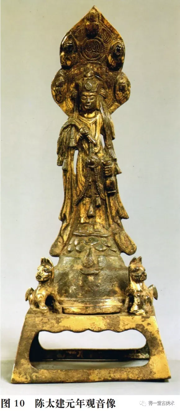 背屏中的化佛作双手合掌,在南朝陈太建元年 (569 年)菩萨立像头光中仍能见到。南朝覆灭以后, 出自建康的化佛作双手合掌这种表现形式,在山东 地区的隋代背屏金铜造像中仍有延续,如博兴龙华 寺出土隋文帝仁寿元年(601 年)张见造观世音像。