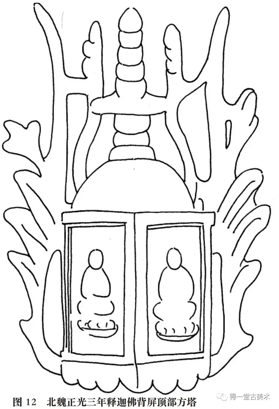 在背屏式造像中,与德基 15 号阿育王塔类似的佛塔造型,南方,在成都出土的南朝造像中较为常见,如西安路梁中大通二年(530 年)释迦像背屏顶部、西安路梁大同十一年(545 年)张元造释迦多宝像背屏顶部、万佛寺双身菩萨立像右侧面浮雕方塔、汶川出土三佛坐像背屏顶部等①。北方,如北魏孝明帝 正光三年(522 年)释迦佛背屏顶部 图十二↑、美国大都会博物馆藏约 6 世纪背屏金铜立佛、云冈第 14 窟西壁浮雕。