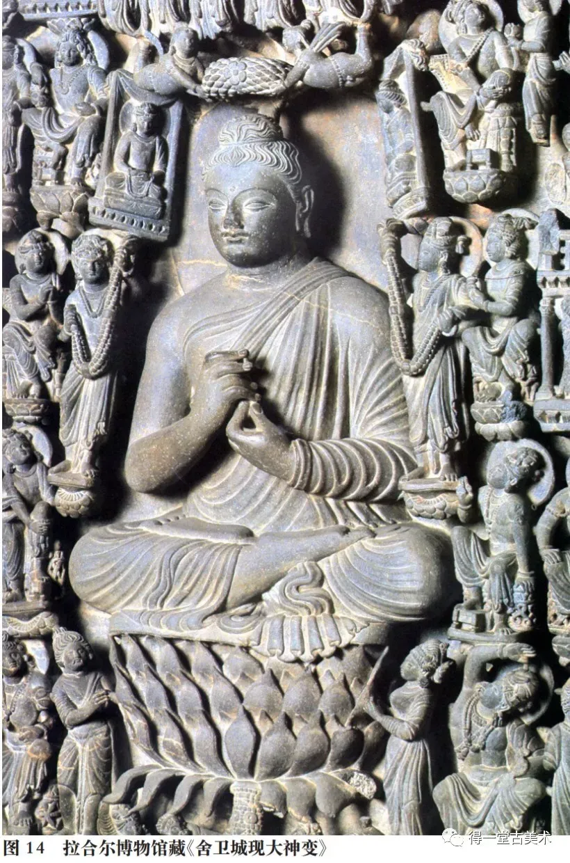 现存佛教造像中,莲花坛基较早见于阿育王为弘传法音敕令建立的诰文石柱,其代表如萨尔纳特 考古博物馆藏萨尔纳特狮子柱头,在四只狮子所立 的圆形底座的下端,饰一仰莲坛基。之后,莲花坛基多见于贵霜犍陀罗地区 2 至 3 世纪的佛或菩萨像, 题材多与《佛本行集经》中的《树下诞生》有关。经文 中描述了悉达多太子降生时脚下生莲的事迹:“菩萨 生已,无人扶持,即行四方,面各七步,步步举足,出 大莲华。”①其中佛坐莲花座多见于《舍卫城现大神变》题材的造像,如拉合尔博物馆藏《舍卫城现大神变》 图十四↑,莲花座顶部的莲蓬以圆盖的形式得到表现,题材取自《普曜经》中释迦坐莲花座于舍卫城幻 化为十方诸佛降伏外道和妖魔的事迹。