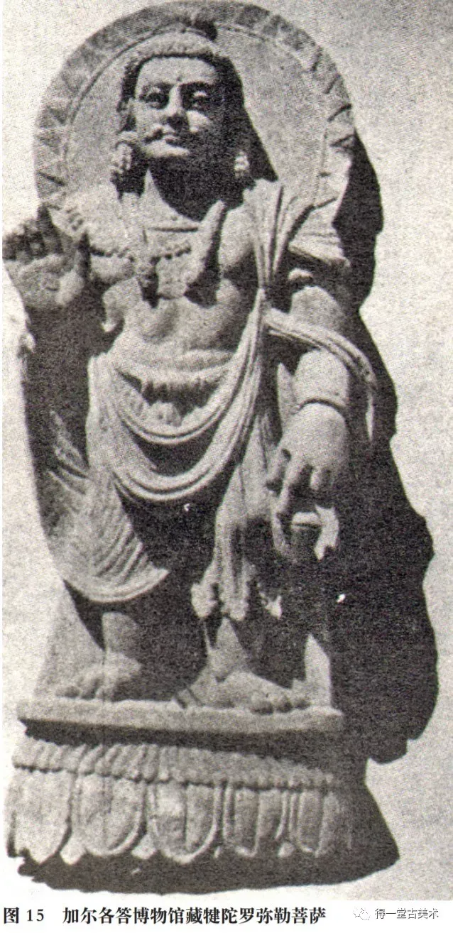菩萨坐莲花座的像例,如拉合尔博物馆藏佛塔 上的浮雕《菩萨居兜率天宫》,菩萨身下的莲蓬及莲 花得到了清晰的塑造。加尔各答博物馆藏犍陀罗弥勒菩萨,是较为少见的立于莲花坛基的像例 图十五↑, 坛基也包含有莲蓬和莲花,只是形态不似中国的半 球体。