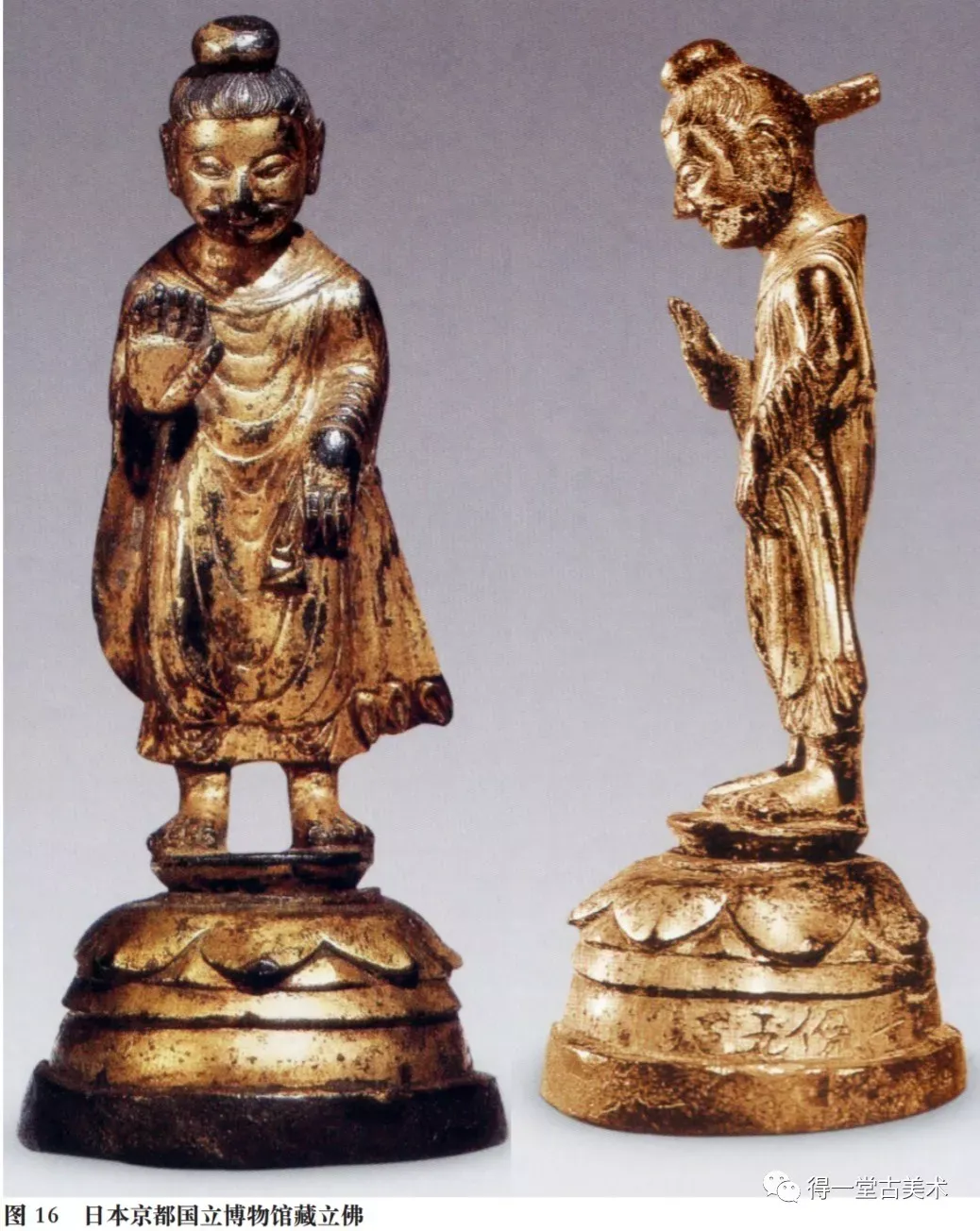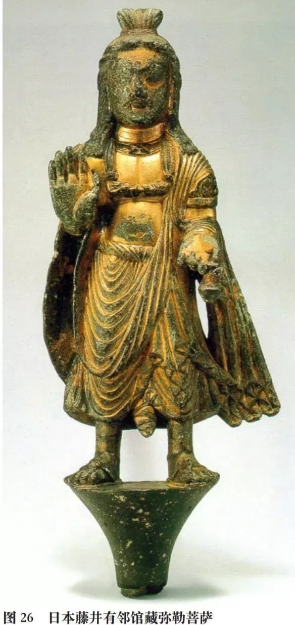 中国佛像莲花座较早见于约 3 世纪中期吴地陶瓷或青铜器物等,如 1983 年南京雨花台长岗村出土青瓷盘口壶上模印的坐佛,即坐于双狮莲花坛基之上。立像莲花座的最早像例,是日本京都国立博物馆藏约 4 世纪初的金铜立佛② 图十六↑,其半球体的莲花高坛已经形成,这类上窄下宽的半球体莲花高坛造型,约 4 世纪初在中国被固定下来。同期陕西三原县出土,藏于日本藤井有邻馆的菩萨立像,残存菩萨 脚下的莲蓬及榫的部分,莲花部分已佚,此像坛基若完整,应与京都国立博物馆藏的金铜立佛坛基类同。 并且藤井有邻馆的这身菩萨立像,与上述加尔各答 博物馆藏犍陀罗弥勒菩萨,在发式、璎珞、帔帛、裙、 手印、持物、坛基等造像因素上均高度相似,可以看出中国佛或菩萨立于莲花高坛的这种表现形式的原 型应与犍陀罗造像关系密切。