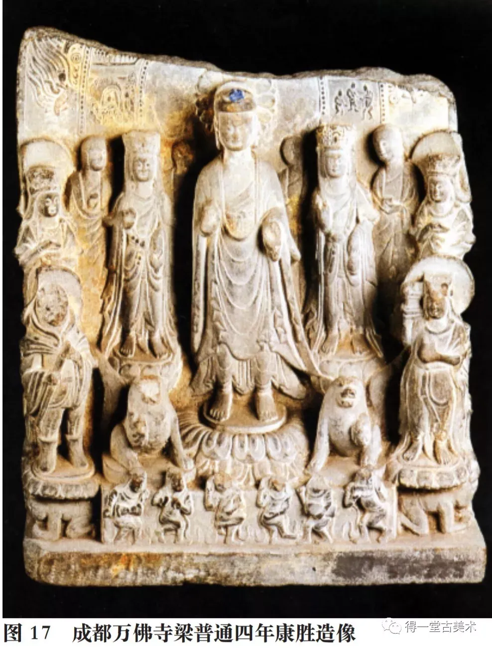 需要指出的是,南朝的莲花高坛似有单层瓣和双层瓣(复瓣)之分,其中单层瓣莲花高坛形式与上 述日本京都国立博物馆金铜立佛相似,像例如成都 商业街出土梁天监十年(511 年)王州子造像。在南京 德基出土的 1- 3、5、6、8、9、16 号南朝造像中,不仅有 佛,也有菩萨立于单层瓣莲花高坛之上,极为常见。 双层瓣莲花高坛的发生时间可能相对要晚,并且应 该是南朝的发明,像例如成都万佛寺梁武帝普通四 年(523 年)康胜造像 图十七↑,德基 4、10 号造像,东京 艺术大学美术馆藏陈太建元年(569 年)观音立像等。