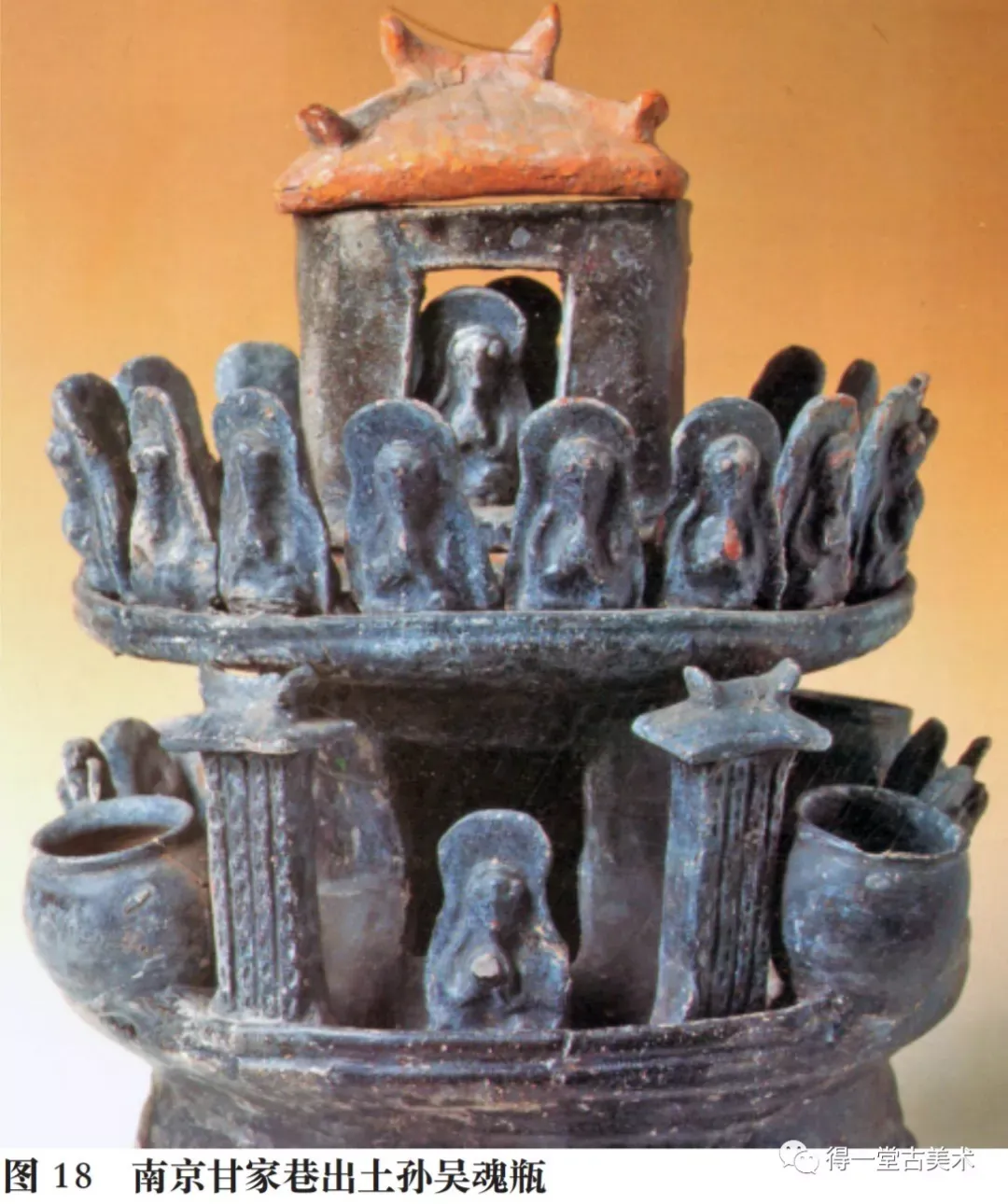 佛作双手合掌在中国的像例,最早可追溯到 3 世纪孙吴时期的魂瓶,如南京甘家巷出土的釉陶魂瓶 图十八↑,器皿分上下两层贴塑了诸多造型相同的 模印小像,均呈双手合掌状,饰有头光、身光、白毫, 肉髻表现不清。