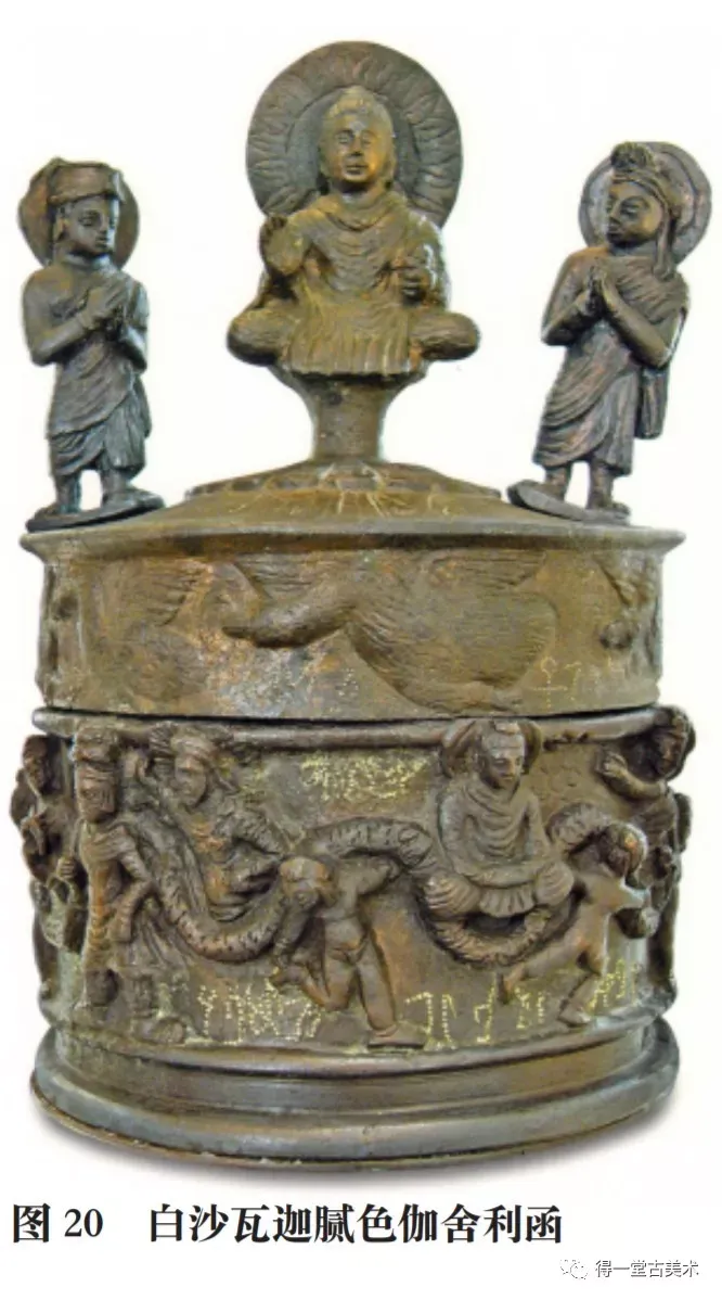 在古印度佛教造像中,双手合掌仅见于天人或 供养人题材。在犍陀罗地区,约建于 1 世纪末、出土于西尔克里(Sikri)的石塔,环绕塔基有十三块佛传故事浮雕,大多故事画中都出现双手合掌的天神形 象,这些天神围绕着佛恭敬地作双手合掌。如《梵天 劝请图》,释迦左右两侧分别侍立梵天和帝释天,二 者 皆 双 手 合 掌 。 出土于白沙瓦桑杰金德里 (Shah- ji- kidheri)的迦腻色伽舍利函 图二十↑,函盖上主尊坐佛两侧分别侍立梵天和帝释天,均作双手合掌,该函发生时间的下限约在 3 世纪初①。