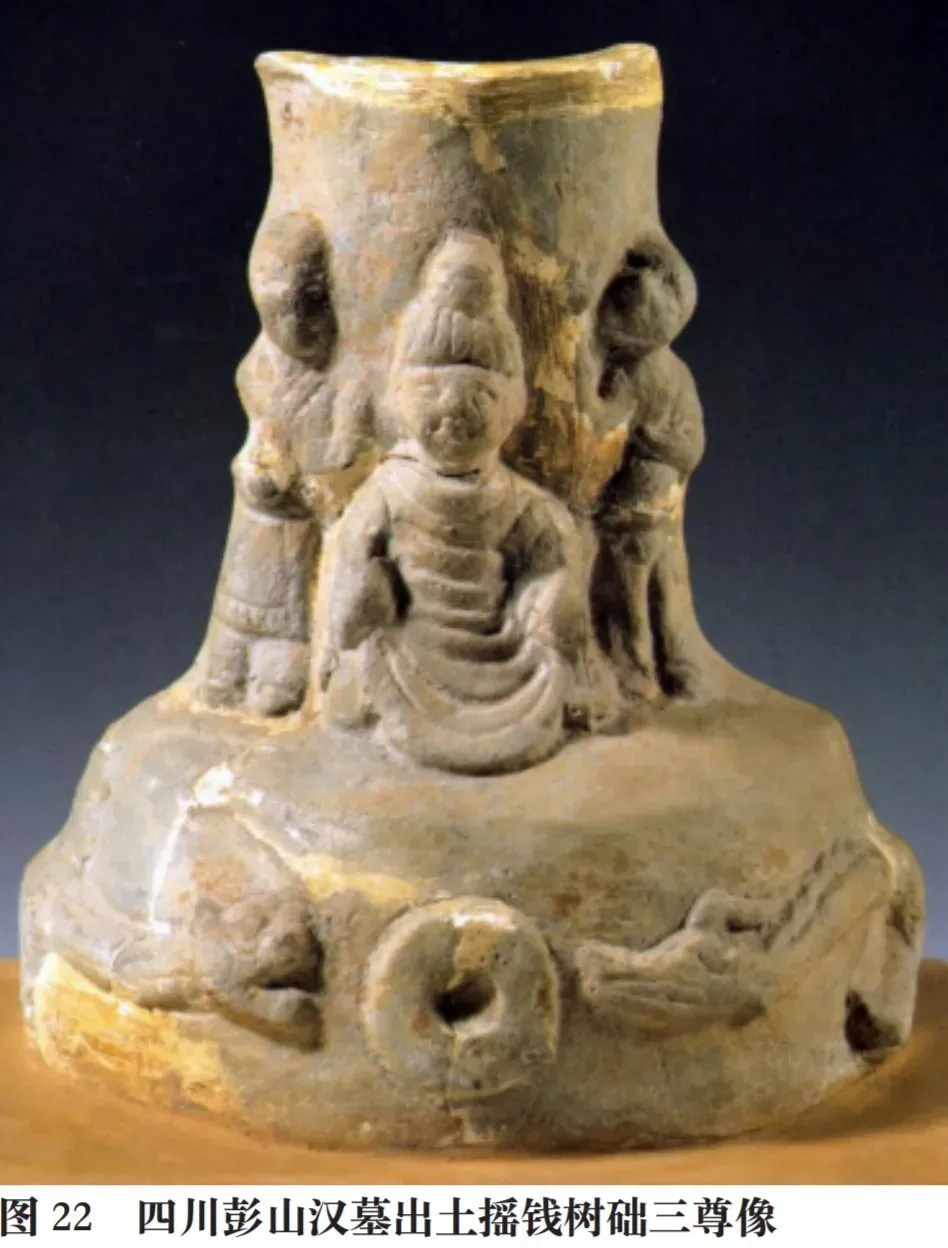 中国现存最早的佛三尊像,是南京博物院藏四川彭山汉墓出土的摇钱树础上的三身造像 图二十二↑, 这无疑是一佛二胁侍的组合,主尊为佛,二胁侍的身份,有观点认为是大势至和观世音菩萨像[21]75,也有认为是祈请祥瑞的胡人[22]41。