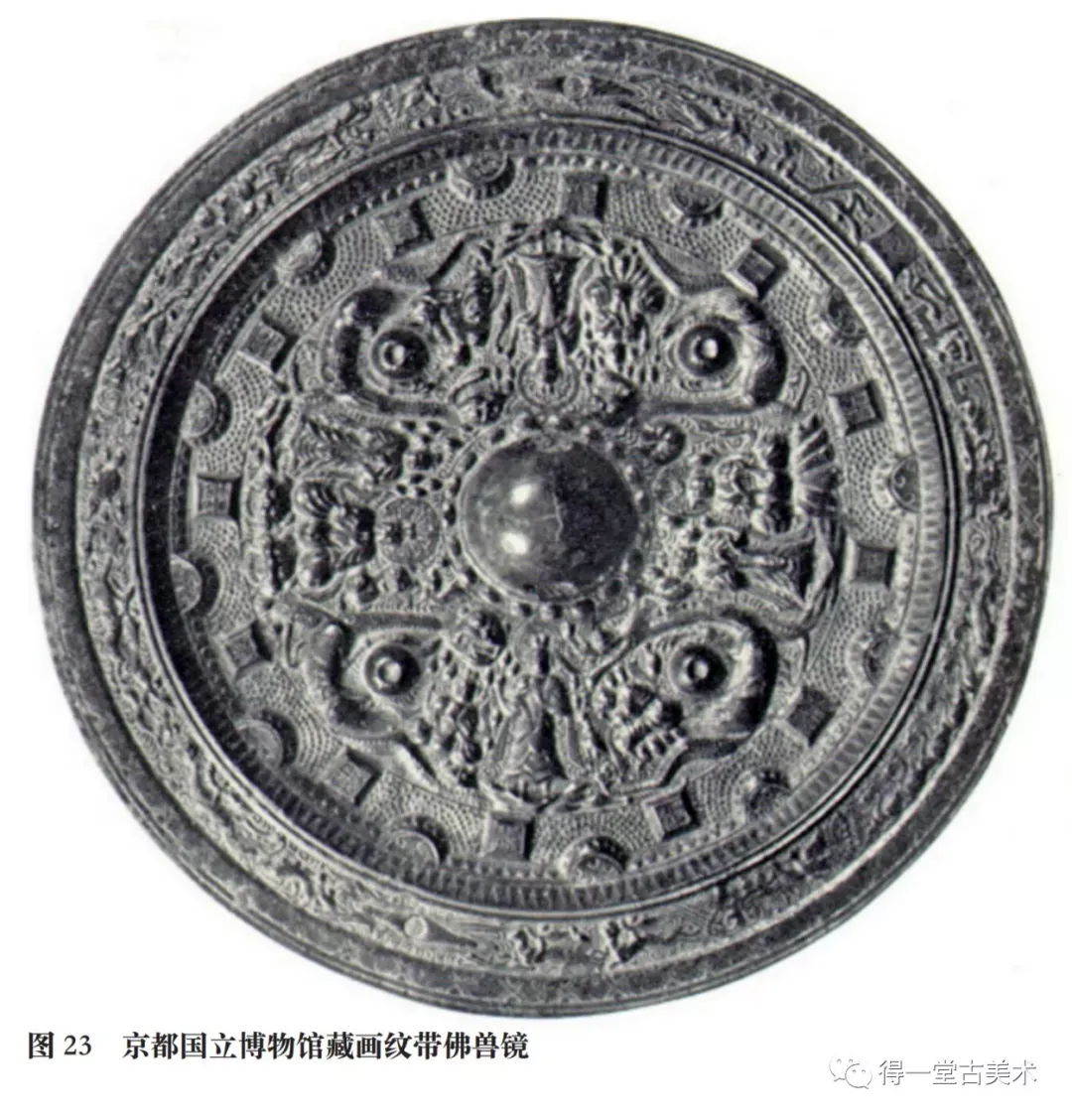 约 3 世纪前后,吴地工匠制造的铜镜上,也出现三尊像组合,如京都国立博物馆 藏画纹带佛兽镜[23]20- 27,[24]633- 634,[25]559 图二十三↑;东京国立博 物馆藏冈山县王墓山古坟出土的佛饰铜镜镜背的四 组造像中,有两组均为三身像。这两件作品中,可以 明确的是半跏思惟像应为菩萨⑤而主尊及另一胁侍的身份究竟是佛或菩萨难以确认,但这也是当时汉地佛教三尊像的具体表现形式。