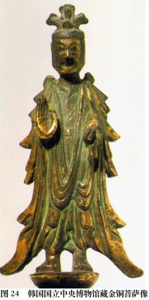 菩萨作三髻,在山东青州地区及麦积山石窟北 魏时期的造像中可以见到,如青州七级寺出土如来 三尊像右胁侍菩萨、麦积山第 163 窟左壁主尊菩萨, 此外还见于日本及朝鲜半岛地区。日本如根津美术 馆藏白凤时期金铜菩萨立像,朝鲜半岛如韩国国立中央博物馆藏金铜菩萨立像 图二十四↑,半岛这件三髻菩萨与德基 10 号菩萨在形态上非常相似。
