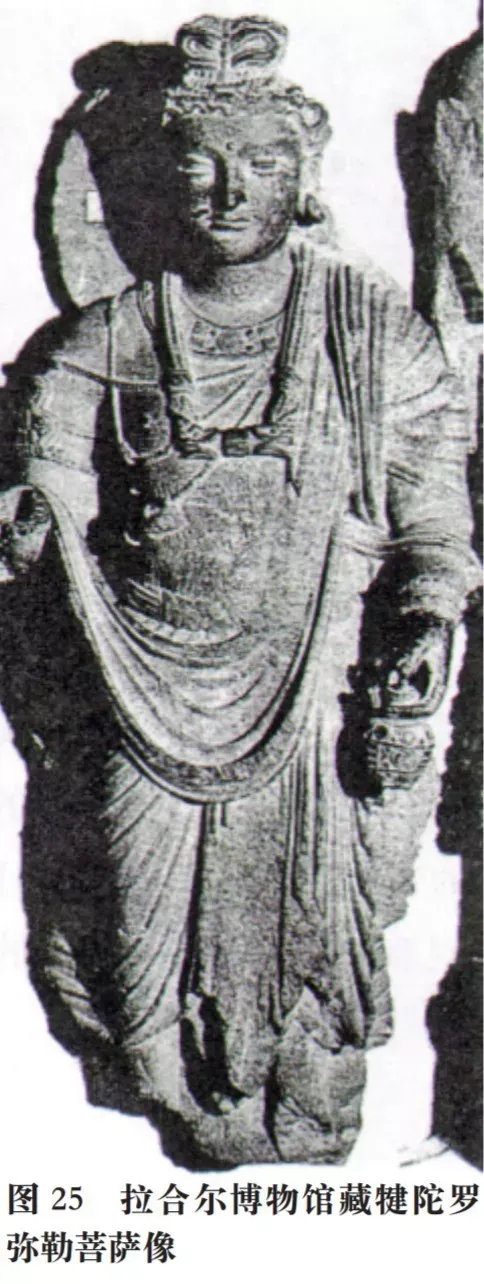 对汉传佛教文化圈内菩萨发髻如此多样的成 因,需予以关注。在犍陀罗地区,弥勒菩萨出现的发 髻作“∞”形,外观类似双髻,如拉合尔博物馆藏犍陀罗弥勒菩萨 图二十五↑。大约在 2 世纪至 6 世纪的弥勒菩萨,基本都保持着一种较为稳定的造型模式,即蓄 小髭,戴项饰,下身着裙,上身着天衣,左手持瓶,右 手上举,如洛杉矶美术馆藏克什米尔出土约 6 世纪 弥勒菩萨②。对此,宫治昭认为:“通过对弥勒菩萨发 型的分析,大致可分为束发式与发髻式两种,还需要 对两者的变化形式再作分类。这种多样性的发型虽 有来自西方的影响,但推测基本仍是源于婆罗门行 者富于变化的发型。”[16]247 在其例举的婆罗门行者的 发式中包括发髻式和由束发式变化出的顶结蝴蝶 结形。