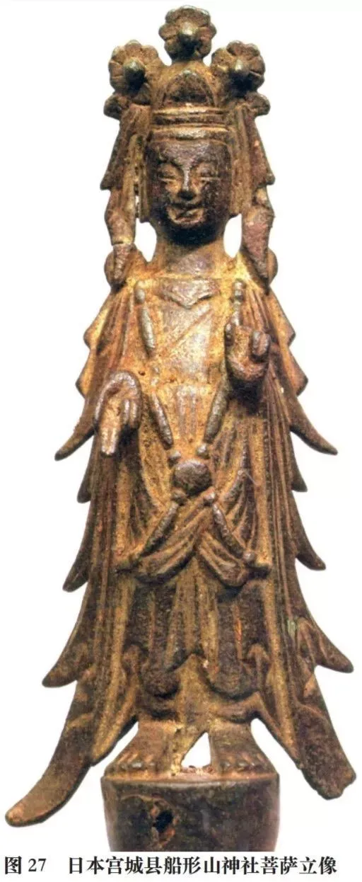三花冠和三珠冠非常相似,其特点均是由三个 圆形物装饰于冠顶,不同之处在于几乎处于同一平 面的三个圆形物,前者是花形,后者是珠形。日本宫城县船形山神社的菩萨立像 图二十七↑,久野健称其宝 冠为“三花冠”[27]146,该像被认为是由朝鲜半岛三国时 代传入的作品。半岛约 7 世纪的菩萨像亦出现类似 的三朵花状物构成的宝冠,另外在北魏孝庄帝永安三年(530 年)菩萨立像、日本个人藏东魏金铜菩萨立 像也能见到类似的三花冠。