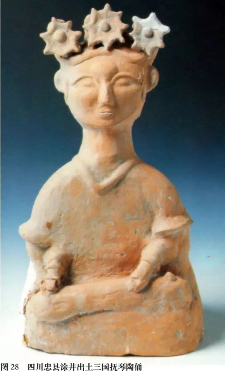 三花冠在已有的德基出土的像例中尚未出现,但 这种冠帽是否源自长江流域值得关注。在四川忠县三国时期崖墓出土的带白毫相的陶俑中 图二十八↑65- 66,[29]108,109,111- 113, 可以见到数身在三髻上各笄花一朵的表现形式(图 28), 外观类似三花冠。这些较早出自南方并受到佛教文化影响的陶俑三花头饰造型,与后来菩萨三花冠在造型 上的相似性显示,二者间应存在某种传承关系。