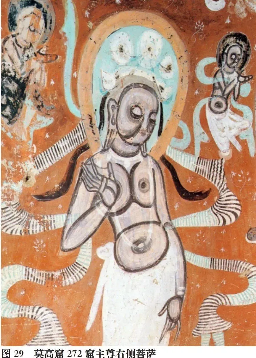 (8)菩萨帔帛多呈 X 型交于腹前,并于身体两侧 呈外展式下垂。
