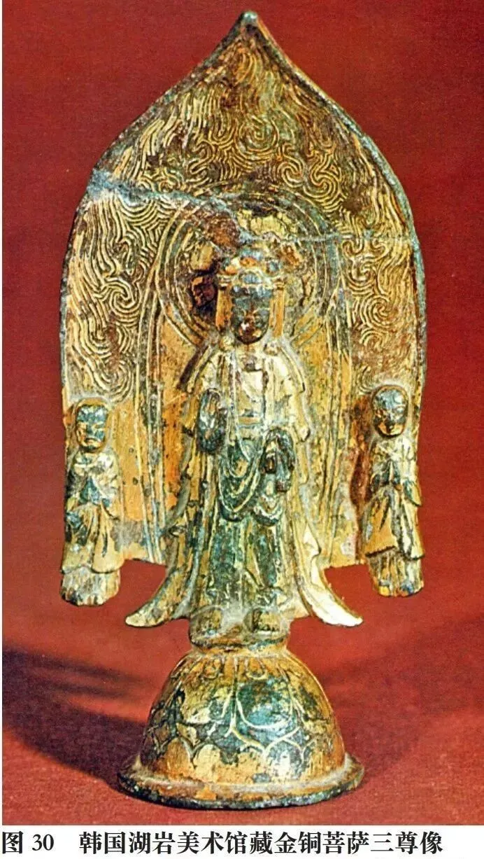 在朝鲜半岛及日本地区,三花冠和三珠冠似多 见于朝鲜半岛。现有像例中,三花冠如前文例举的两 身菩萨造像,三珠冠如韩国湖岩美术馆藏 6 世纪金 铜主尊菩萨像 图三十↑,该背屏像与德基 16 号极为相似,无论是主尊菩萨头戴三珠冠,左手下伸二指,X 型帔帛,还是左右二胁侍弟子双手合掌,背屏三尊 像,均可发现其南朝渊源。另还有癸未(563 年)铭金 铜佛三尊像中的二胁侍菩萨、韩国国立扶余博物馆 藏百济 6 世纪金铜菩萨立像、韩国国立中央博物馆 藏百济约 6 世纪中叶菩萨立像。可见朝鲜半岛的菩 萨戴三花冠和三珠冠,为直接由南朝或经由青州间 接传入的可能性很大。