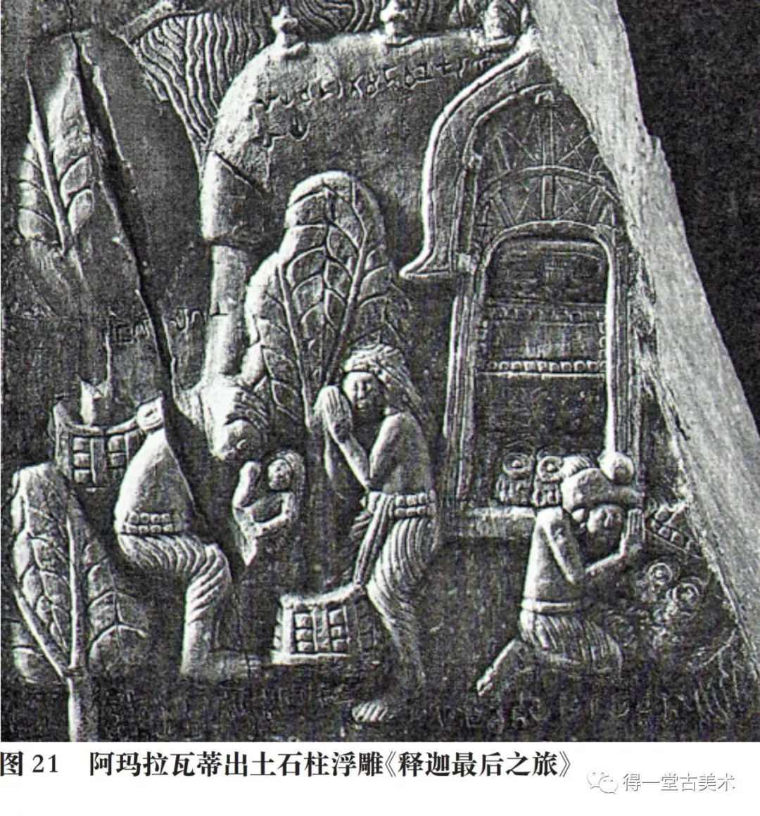 在南印度,阿玛拉瓦蒂出土约 2 世纪石柱浮雕 《释迦最后之旅》图二十一↑,出现树前一人双手抱婴,另 一人双手合掌的图像,铭文显示为:多子圣树/毗舍 离诸圣树。该浮雕内容出自《大般涅槃经》,圣树是释 迦途经毗舍离所见的六棵圣树中的三棵,其中就有 多子圣树,体现了民间的圣树信仰。双手合掌者、多子圣树及树前抱婴者的图像组合,赋予图像以供养 人祈子的含义[16]71- 73。