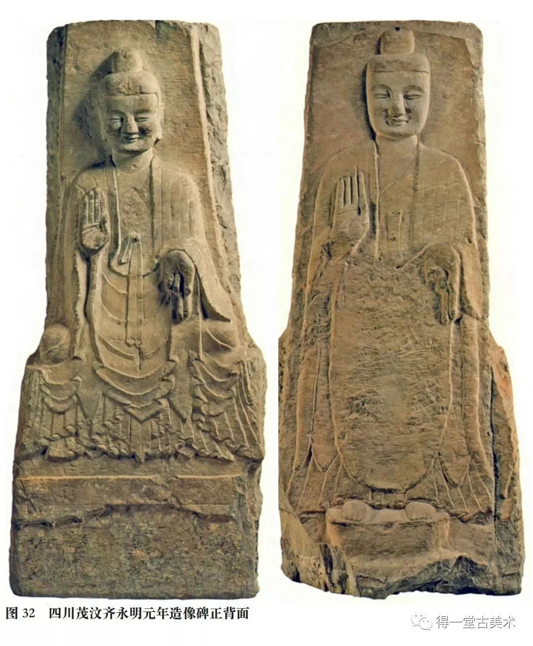 在中国,佛教造像何时大规模出现主尊手印由 禅定印向无畏与愿印转变,需进一步认识。造像左手 手心向外,手掌伸直下垂,这种手印被称为与愿印。 与愿印不见于古印度佛像,现存较早的中国与愿印 佛像,应为东京国立博物馆藏北魏太武帝太平真君四年(443 年)菀申造像。四川茂汶齐永明元年(483 年)造像,应是左手下伸两指最早的纪年像 图三十二↑, 其正、背面的两身佛像均着“褒衣博带式”佛衣,右手施无畏印,左手下伸两指。在这之后成都地区齐梁年间出现的“褒衣博带式”佛像均施无畏与愿印,只是在左手施与愿印的形式上略有不同,有的食指、中指两指下伸,有的仅食指一指下伸,有的食指略作内勾状,有的四指均内曲,这些不同的表现应都同属“与 愿印”的范畴。现有实物资料显示,这种施无畏与愿印至迟在 5 世纪末,已与“褒衣博带式”佛衣形成固定组合。