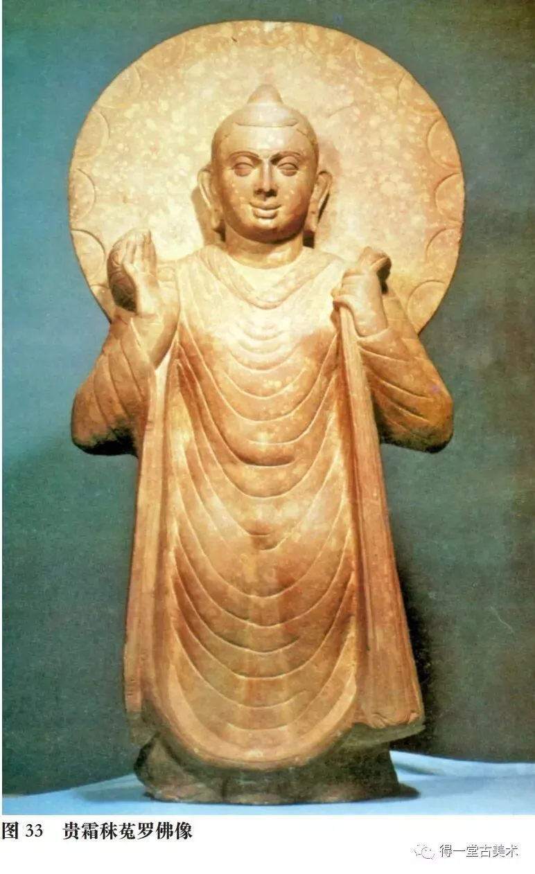 现存完整的东汉至十六国时期的佛像显示,凡 右手施无畏印者,左手均握衣角。两手的这种处理方 式,源自古印度佛像,贵霜犍陀罗和秣菟罗佛像均有这种表现形式 图三十三↑。