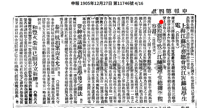 [5]张謇,沈同芳.《张謇等为停课事致三江师范学堂总办李观察书》(1905年)//《申报》.1905年12月27日(第11746号).