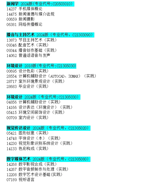 南京传媒学院自考学位课程(初定)